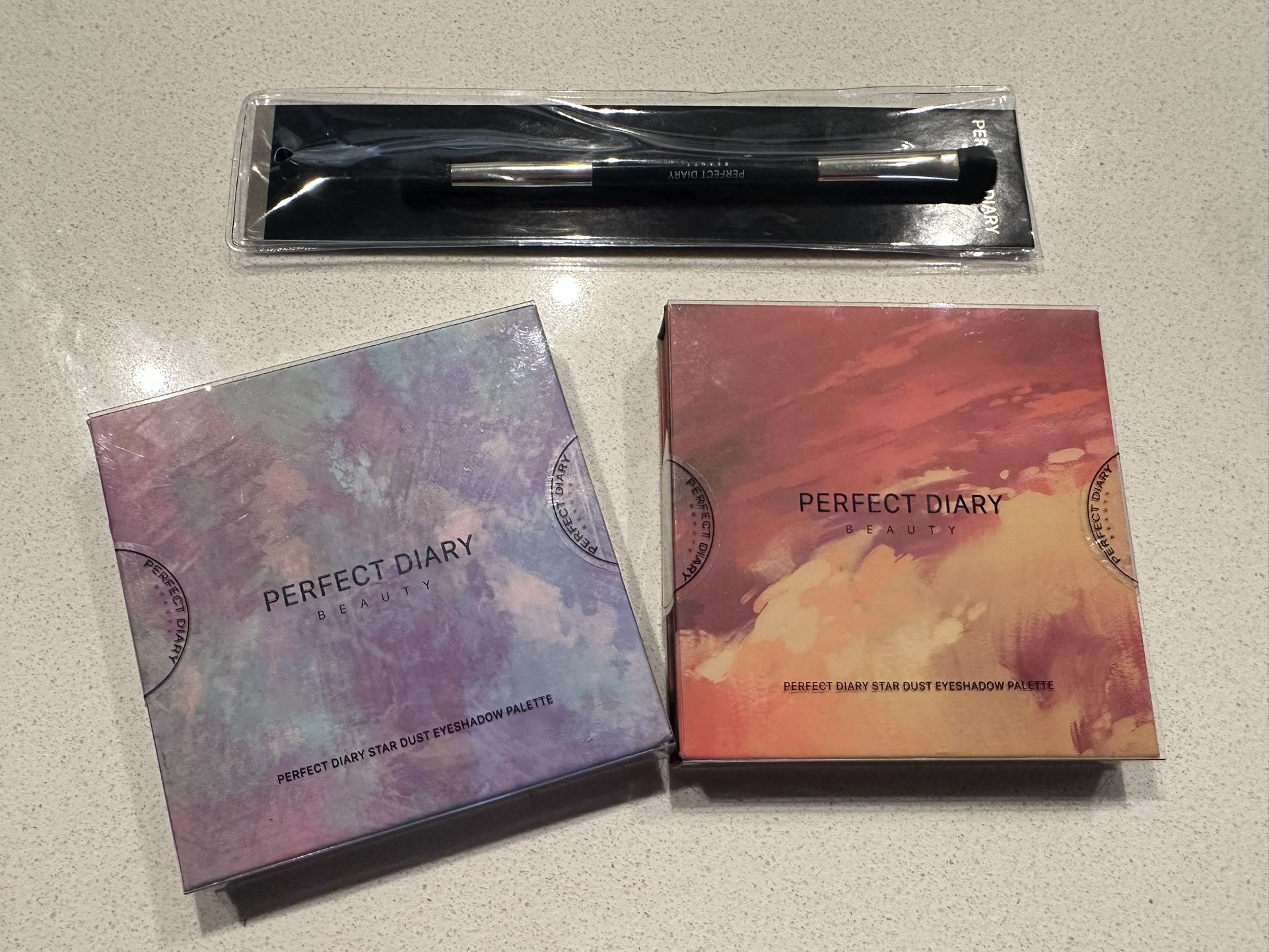Perfect Diary Eyeshadow Palette x 2 + Eyeshadow brush (New) Everything is new. Original price over $60 ($29 without tax each + Eyeshadow brush) $10 each or set of 2 + eyeshadow brush for $15 Perfect Diary Eyeshadow Color 01: Violet Temptations & 02: Les Feuilles Mortes Pickup only.