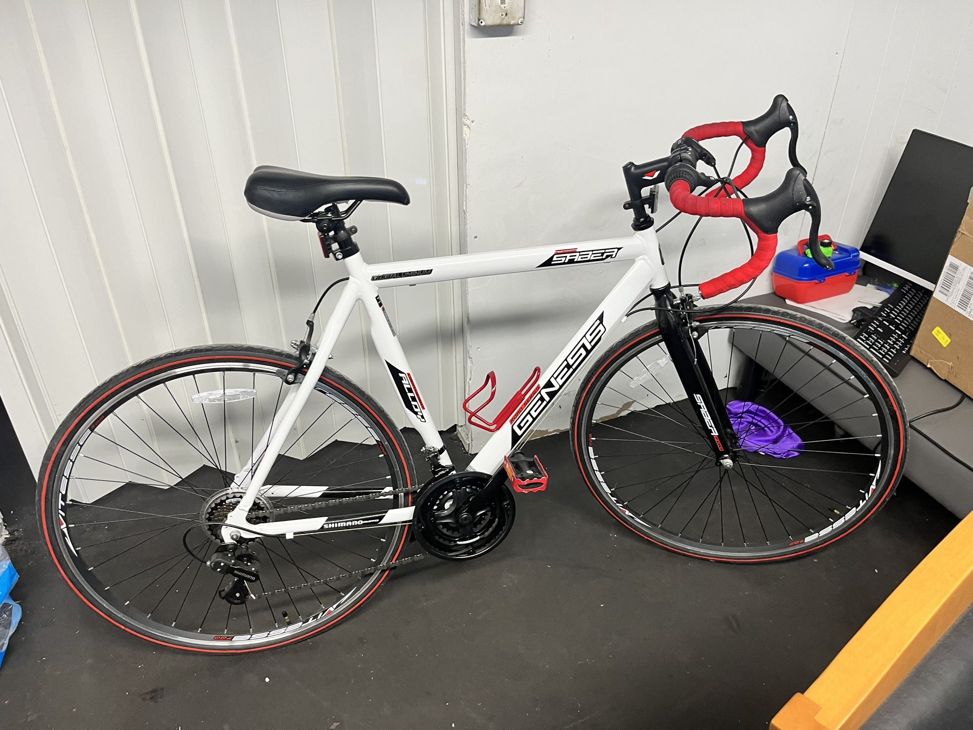Genesis 700c Saber Road Bike. Frame Size: Medium Sure-grip handlebar wrap The water bottle cage included Front and rear alloy caliper brakes 32" stand-over height Shimano derailleurs Shimano Revo twist shifters Fits riders 5'8" to 6'2" Lightweight aluminum frame Kickstand included Ideal for Adult Males 21 Speed drivetrain