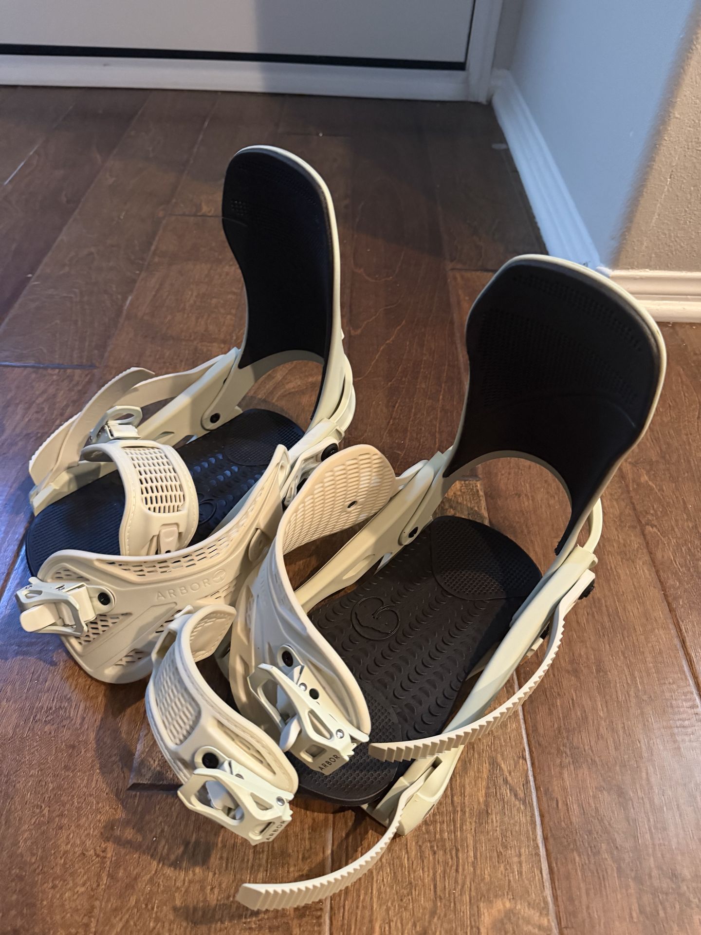 Selling a pair of Arbor snowboard bindings in a clean white/cream colorway. Great all-mountain bindings—comfortable straps, solid support, and they’re in good shape overall. Details: • Brand: Arbor • Color: White / cream with black footbeds • Size: M/L (fits most men’s boots roughly 8–11, depending on model) • Condition: Used, good shape (normal cosmetic wear, no cracks) • Straps & buckles: all working (ratchets click/hold)