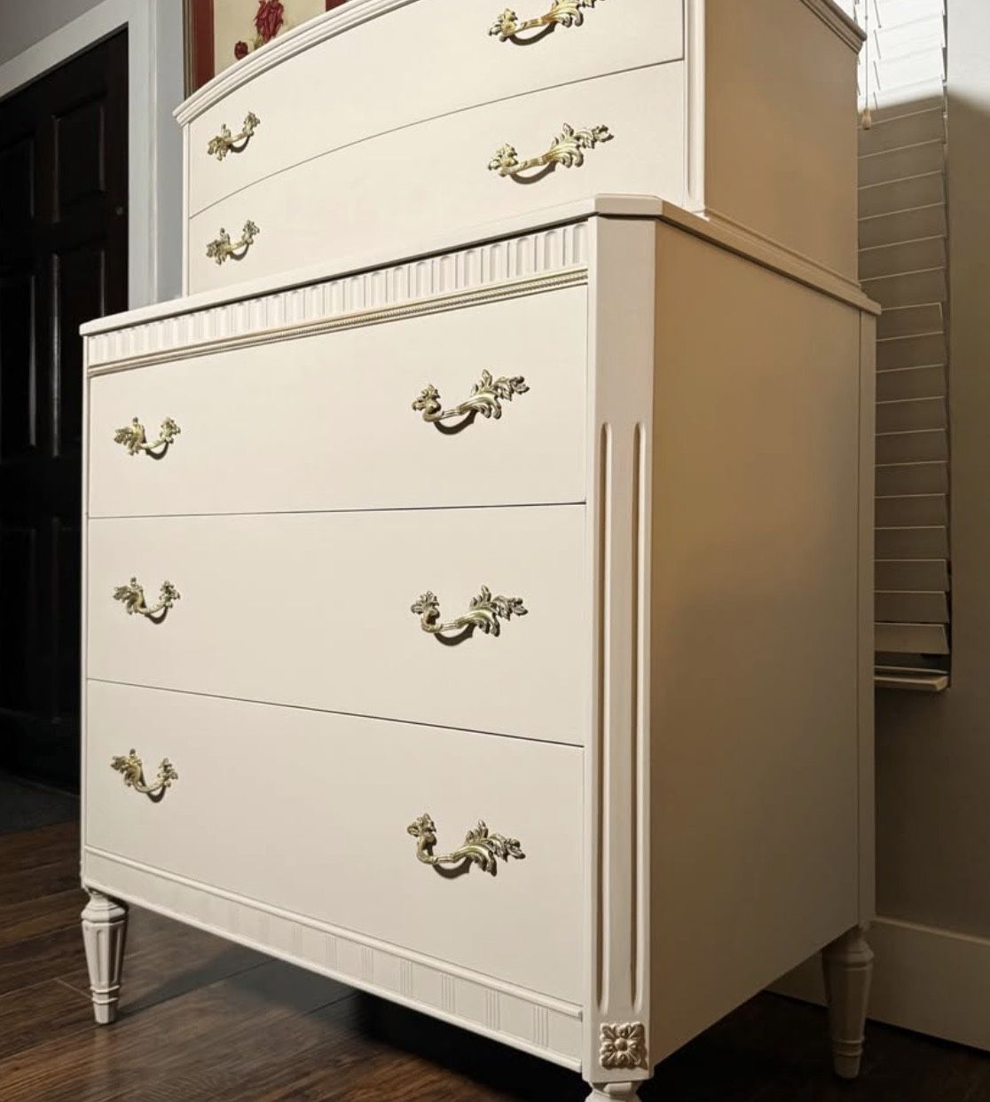 ✨ Charming Vintage Tall Dresser ✨ Beautifully refinished in a soft beige shade, this classic piece showcases its original gold hardware and solid wood construction. It has only minor age-related marks and remains in excellent overall condition. 📏 Dimensions: • Height: 54” • Width: 37” • Depth: 23” A stylish and functional dresser that brings warmth and elegance to any room. Delivery is available for an additional fee. Unique vintage pieces like this don’t come around often—don’t miss your chance! ⭐️ Thank you for looking! ⭐️ TALL DRESSER • VINTAGE DRESSER • ANTIQUE DRESSER • SOLID WOOD DRESSER • DRESSER