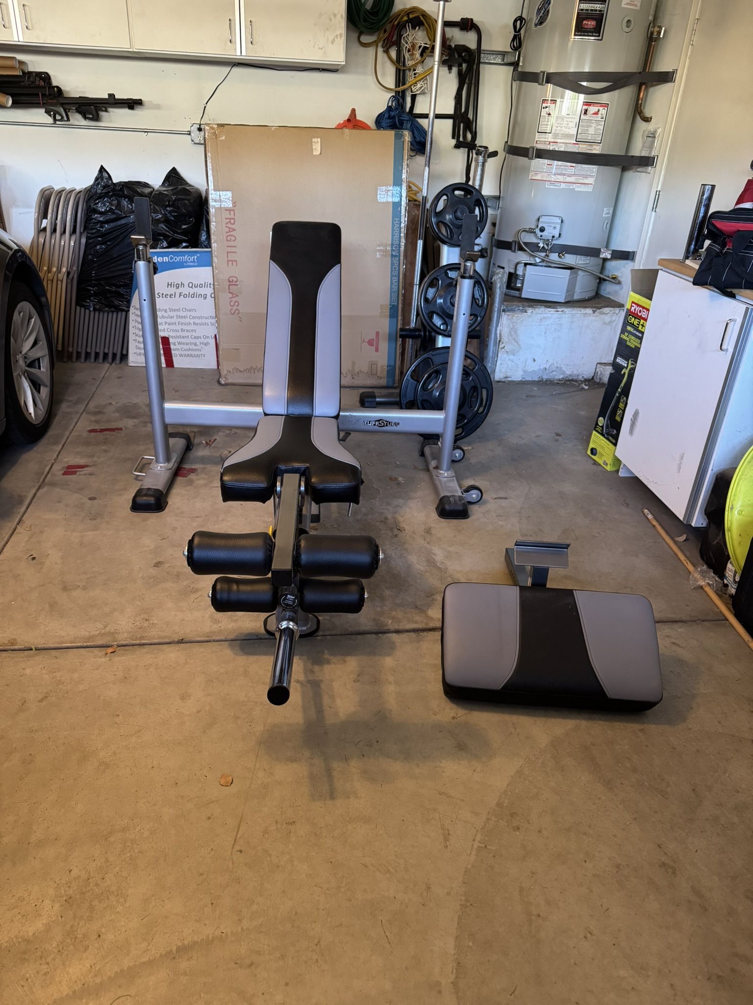 Tuff Stuff weight lifting bench including preacher curl attachment. Includes both instruction manuals. Weight and bar rack including 4ft curl bar and 7ft bar. 135 lbs of rubber coated weight plates 5lbs x 4 10lbs x 2 25lbs x 2 Plus a 25 lb plate that’s all metal. Available for pick up only