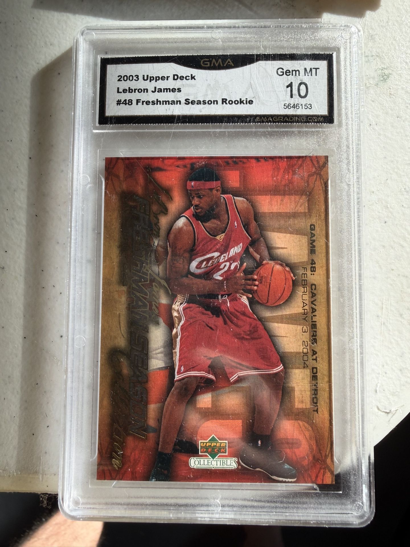 2003 Upper Deck LeBron James #48 Freshman Season rookie card graded GMA Gem Mint 10. Sharp eye appeal and clean slab. Great affordable LeBron rookie for collectors or investors. Ready for display or collection. Serious inquiries only.