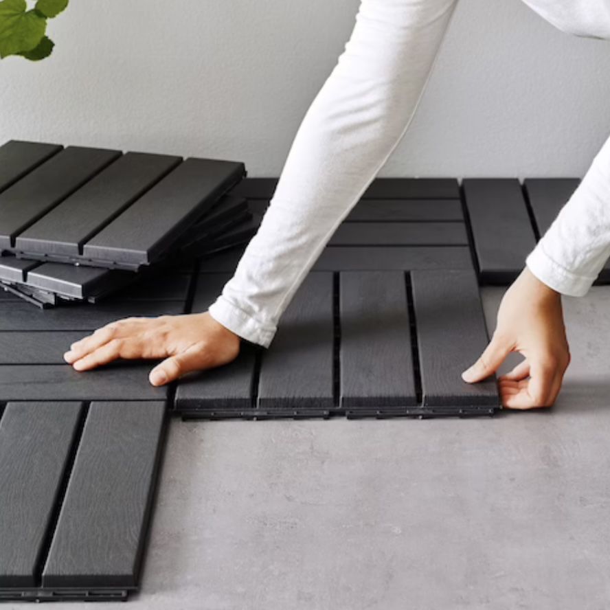 IKEA RUNNEN Decking, 2 Packs + 2 spare Tiles IKEA price : $30 each 9 sq feet each 9 Tiles per package Thickness 3/4 " Easy Assembly Outdoor Dark gray