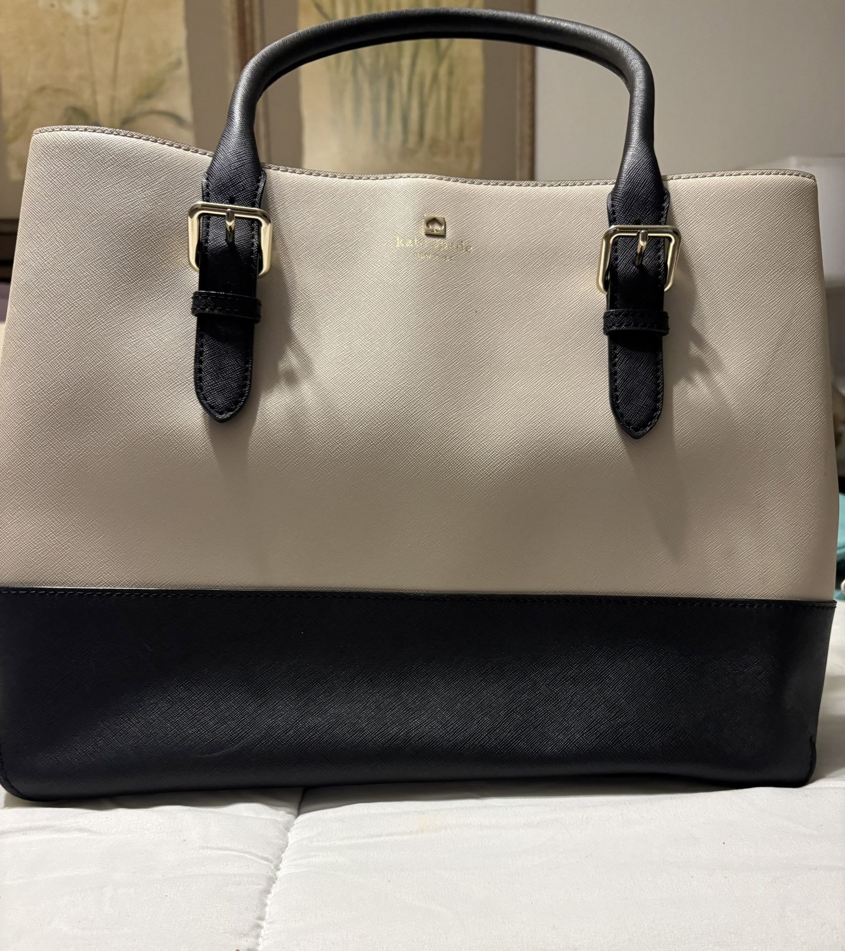 Elegant tote with a cream top and black bottom. Features durable handles and gold-tone hardware. Perfect for daily use. Large enough to hold a laptop. Good for office use.