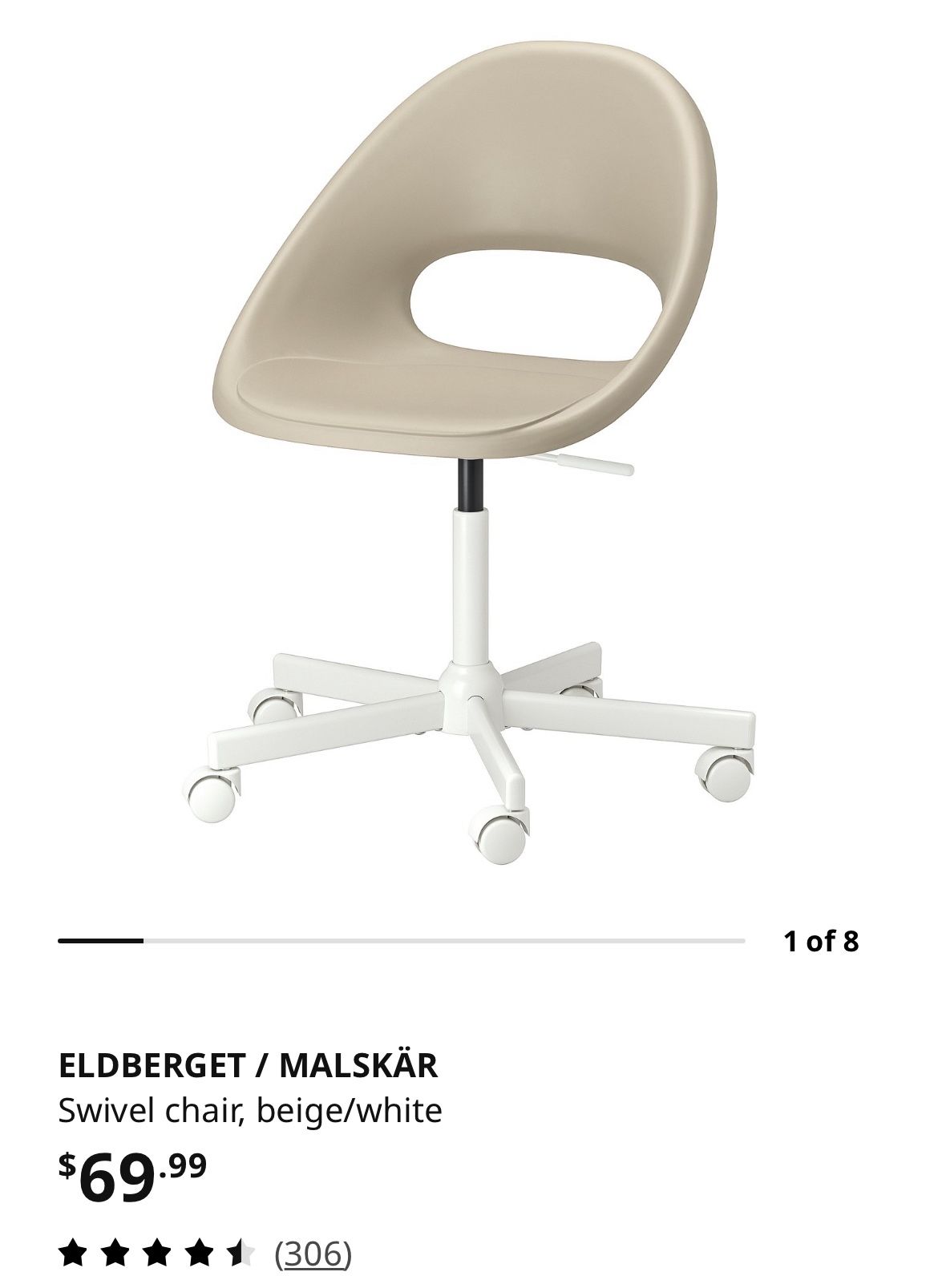 Modern swivel chair. IKEA ELDBERGET / MALSKÄR model. Beige seat with white base. Has wheels for easy movement. Great for office desk. Very little use.