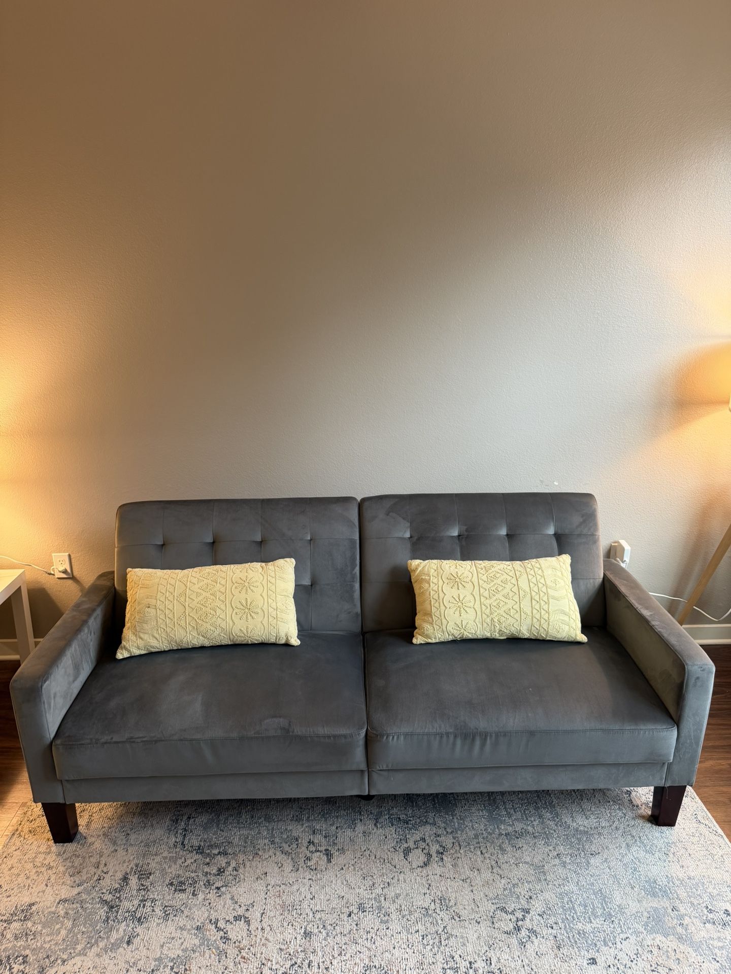 Modern gray sofa that easily converts into a bed — perfect for small spaces, guests, or apartments. Very clean and gently used No major stains or damage Comfortable for both sitting and sleeping Neutral color that matches any decor Functions as both a couch and a bed I bought it from walmart for 400$