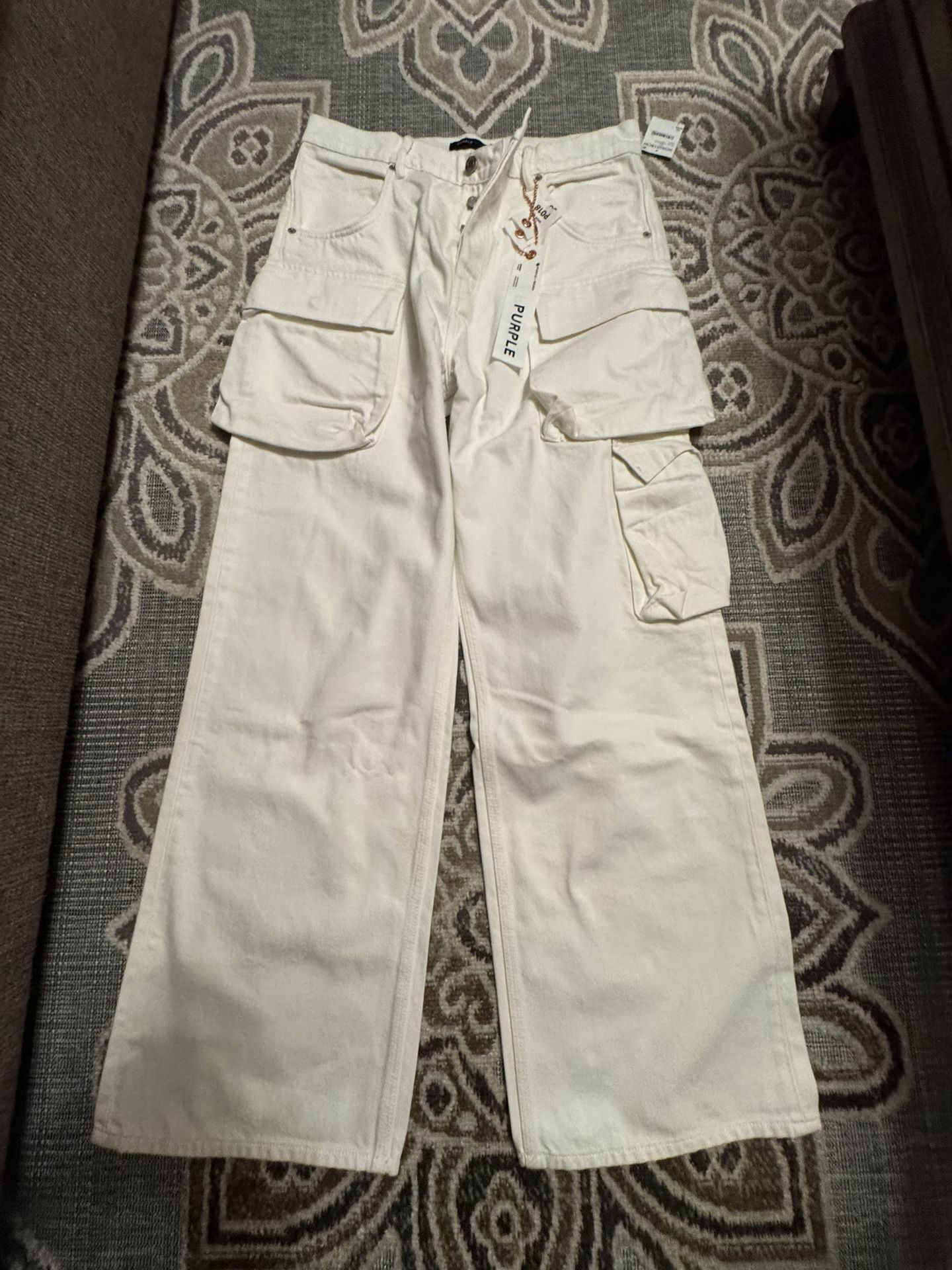 "Purple" brand Triple Pockets Authentic New , Size 33 , Color White Bone , I was Brought in Nordstrom, lineup and feature a unique wide-leg, multi-pocket design. Key design elements visible include: Triple Pocket Configuration: Large cargo flap pockets on both thighs, with an additional smaller stacked pocket on the lower left leg. Branding: Distinctive "PURPLE" hangtag and internal waist label. Construction: Heavyweight twill or denim fabric with a relaxed, wide-leg fit and button-