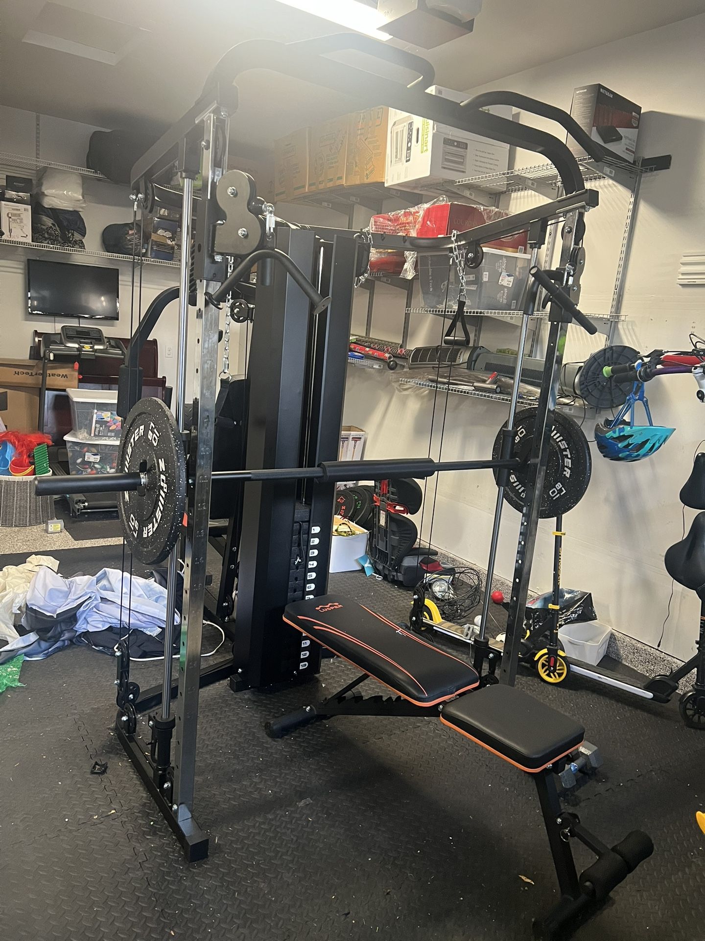 Complete home gym set as shown in photos. You will have to arrange your own pick up and disassembly if needed. Move out sale.