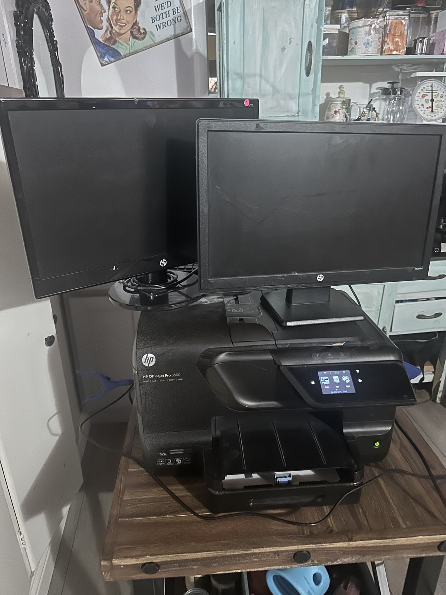 Monitors and printer as a bundle. Asking $100 printer is out of ink. No longer need these anymore.