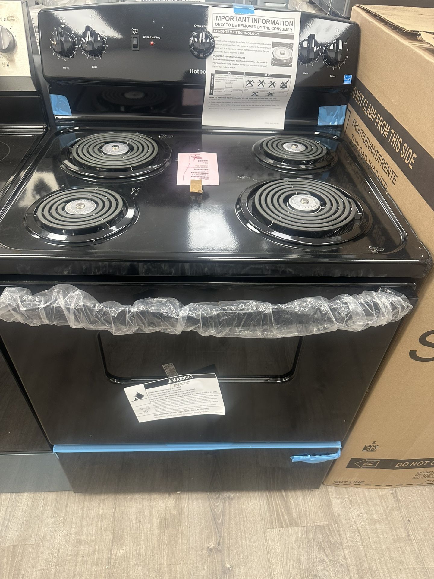 Never used Hotpoint electric stove, black color Model #: RBS330DRBB HD price: $608 Our price: $350 Manufacturing warranty