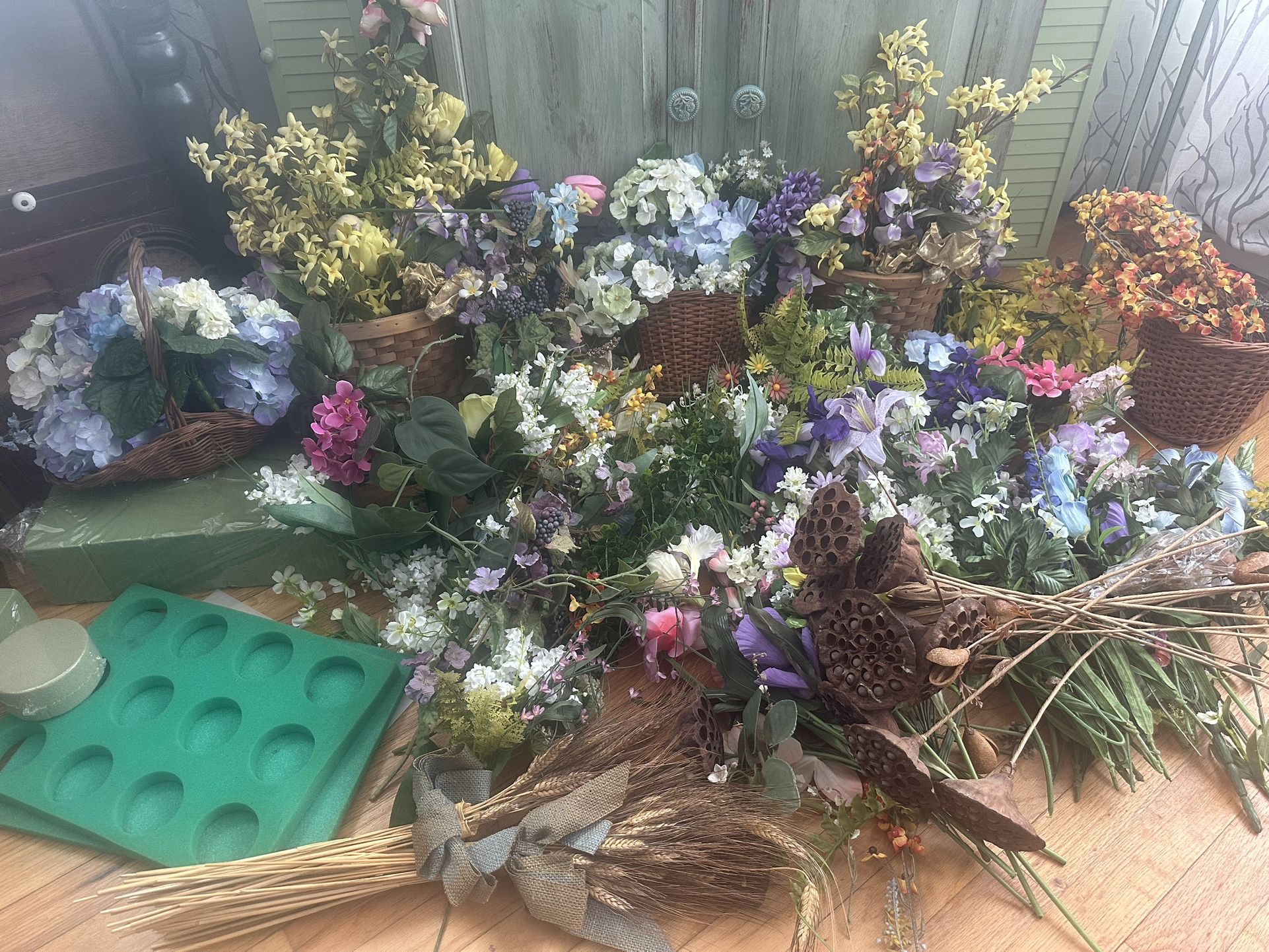 Large bulk lot of high-quality artificial flowers and floral décor supplies. This is approximately three full storage totes worth (two 18-gallon totes and one 20-gallon tote) of silk florals, greenery, fillers, pre-arranged baskets, floral foam blocks, decorative stems, grasses, wheat sheaves, vines, and textural elements. Includes multiple finished basket arrangements plus hundreds of loose stems and supplies. Estate find, not cheap craft-store quality. Many pieces are vintage or older and very well made. There was additional floral material still in the totes that isn’t pictured, including extra stems and fillers. Also includes a small glass vase with silk roses and a couple of extra wreaths. Photos show the full lot both spread out and packed back into three large storage totes for scale. Totes are not included and are shown only to demonstrate the sheer volume of florals in this lot. Perfect for event or wedding décor, florists and designers, theater or prop departments, art students and installations, photo shoots, resale, or crafting. Stored in a basement and have a mild storage odor. Selling as one bulk lot only. Local pickup only. Feel free to make an offer!