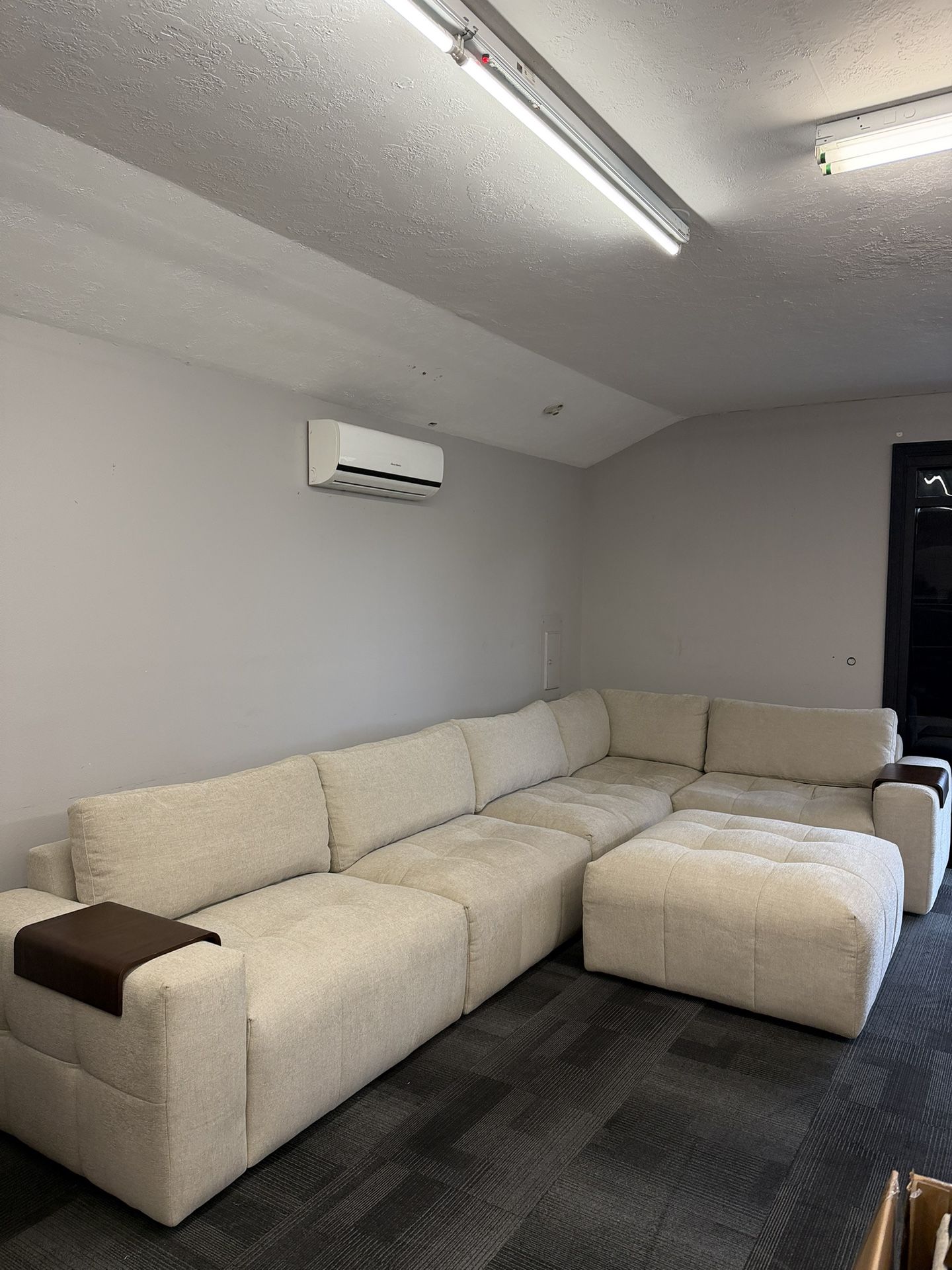 Paige 6-piece Modular Fabric Sectional Modular Modern Design for Flexible Layouts Deep Seating with High - Resiliency Foam Cushions FSC, GreenGuard Certified, Responsible Down Standard (RDS) Sourced Feather-wrapped Foam Seat Cores Matching Ottoman Removable Wood Arm Trays Overall Sectional Dimensions: W x L x H 132 in. x 132 in. x 35.6 in. Ottoman Dimensions: W x L x H 42.5 in. x 42.5 in. x 21.2 in. Message me for any questions!