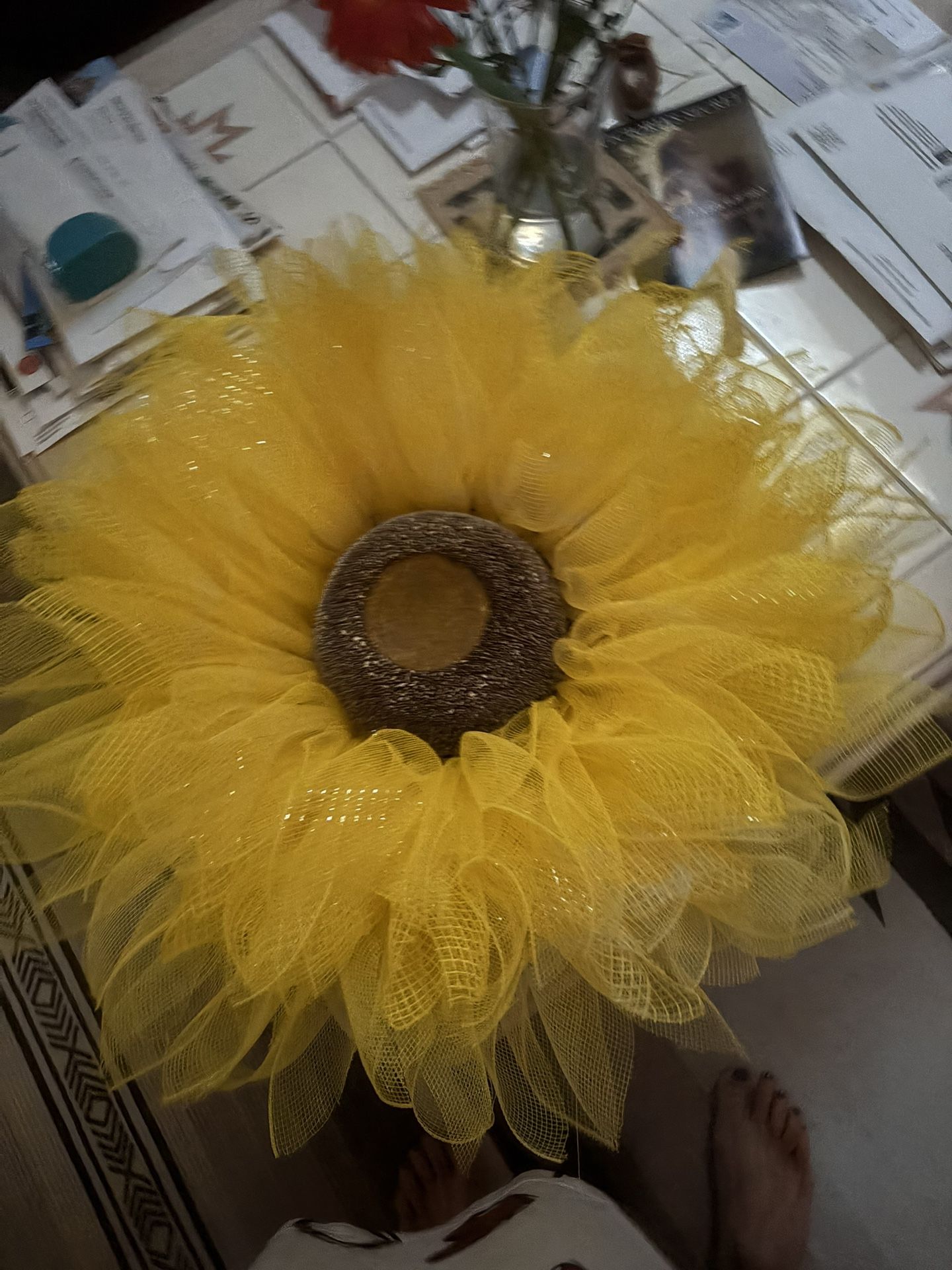 Bright deco mesh sunflower wreath