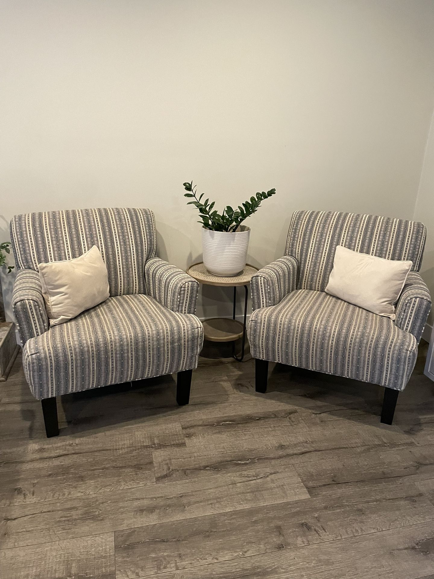 Grey and blue patterned fabric arm chairs are in fantastic condition and great for a living room!