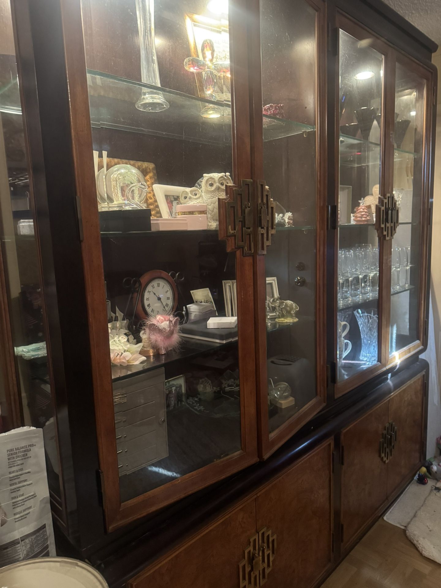 Huge light up China cabinet. Very heavy. Cabinets underneath. Comes apart. 6 glass shelves that are heavy. Good condition. $500 or best offer.