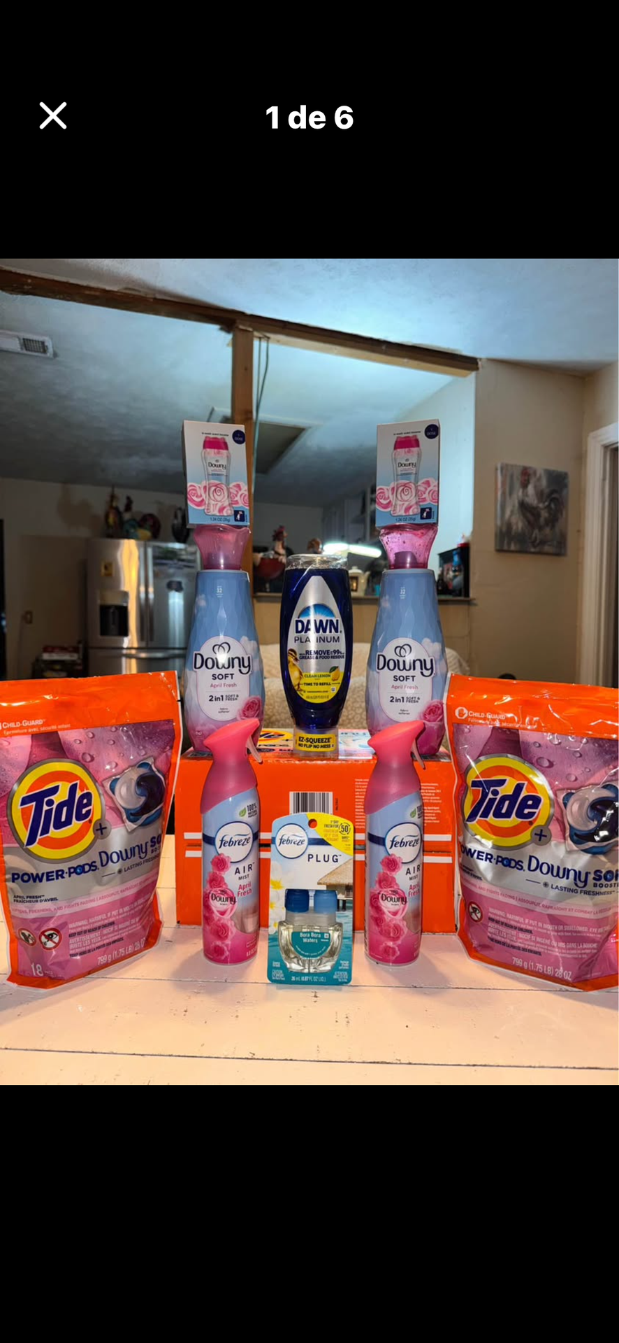 Paquete tide pods XL 2 paquetes de tide pods XL de 18 bombas cada una 2 botellas de downy de 32 lavadas por botella , 2 cajitas individuales de perlas, 2 febreze en spray, un aceite esencial plug febreze , 1 jabón Dawn platinum de 20.5 oz , todo por $30