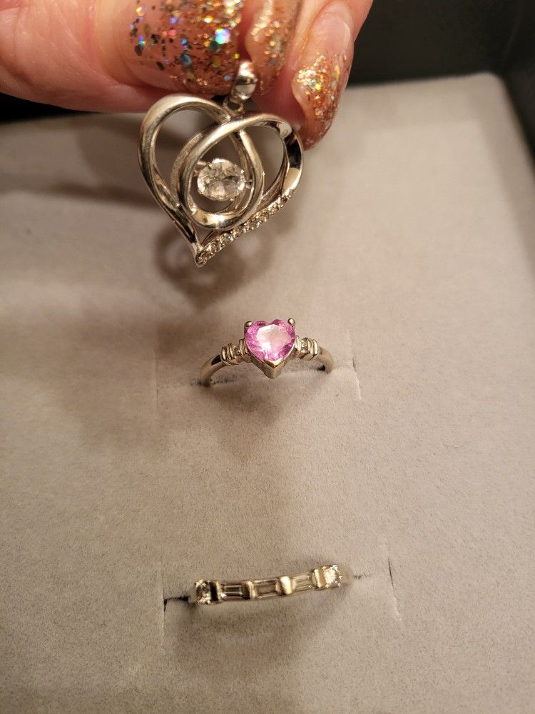 Pink heart ring 10K carat white gold size 5 $200 14 kWhite gold size 7 ring diamonds on each side $400 sterling silver heart pendant floating Stone $150
