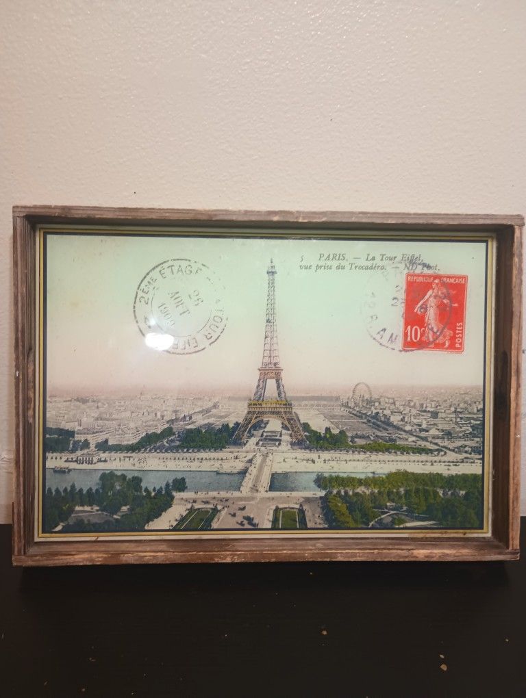 Vintage serving tray with a print of the Eiffel tower in Paris France under glass Dimensions 20"×14"