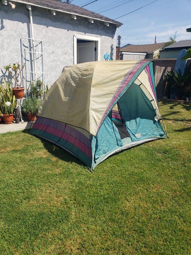 Camping tent. Size 3 person. Works perfect and in great condition. All complete with tent, poles, rainfly, stakes, ropes, and carry bag. Measures 7 ft x 7 ft x 5 ft tall.