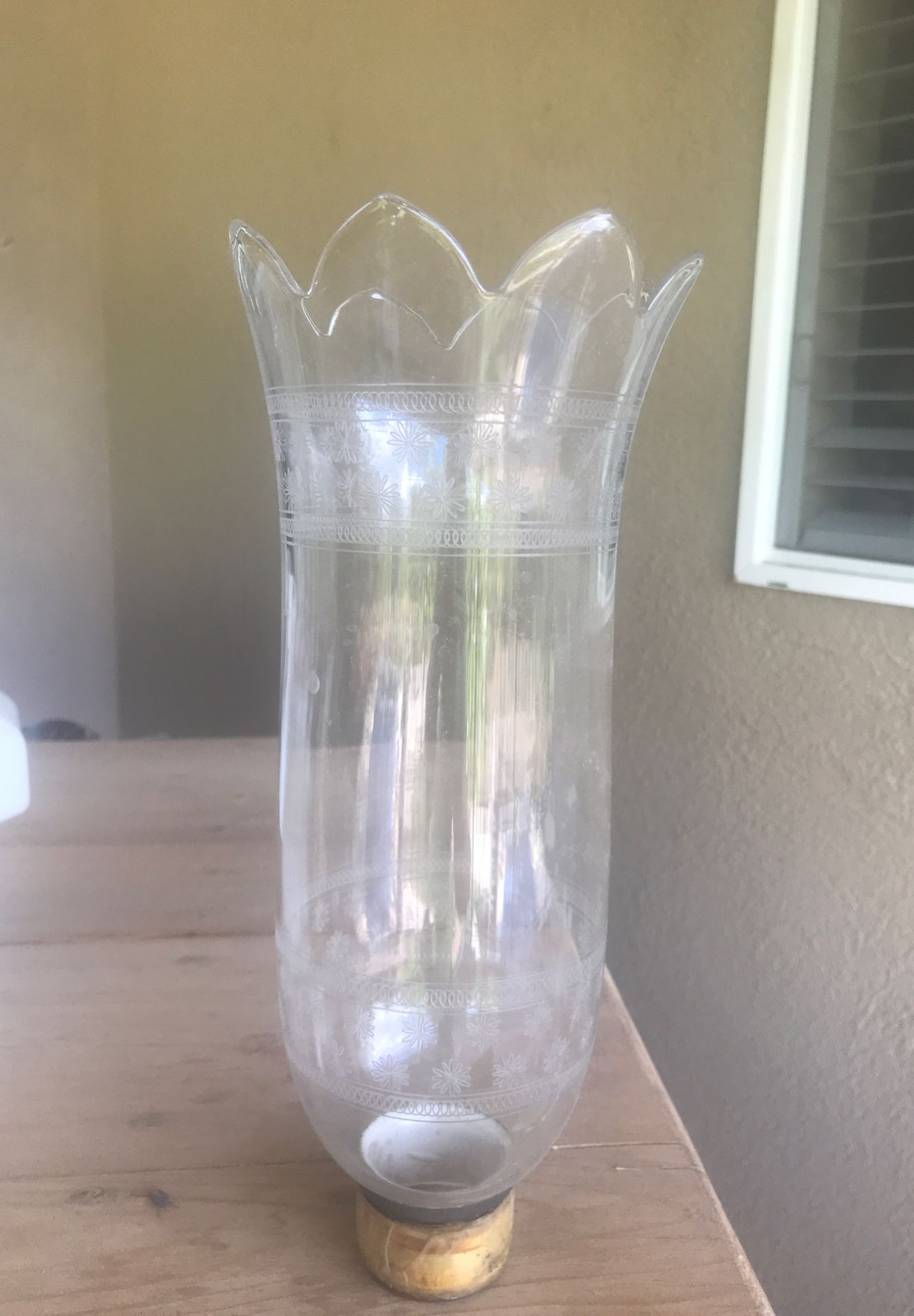 This beautiful shade is 11” tall about 5” in diameter and a 1-1/4” fitter. It has beautifully etched flowers.
