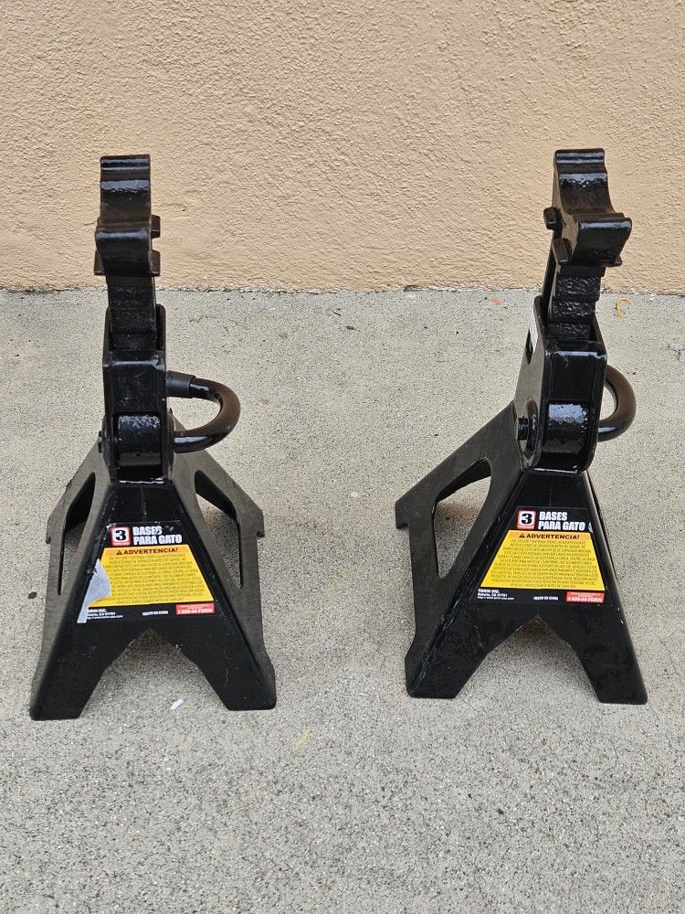 Selling a pair of Torin Black Jack 3-ton heavy-duty steel jack stands in excellent condition. These are a must-have for safe DIY auto repairs like oil changes or tire rotations. Key Features: Capacity: 3 Tons (6,000 lbs) per pair. Safety First: Features a double-locking pawl and tooth design for extra security while working under your vehicle. Adjustable: Multi-position forged iron ratchet bar with sawtooth design for quick and secure height adjustments. Range: Lifting range from approx. 11.25" to 16.75". Stability: Wide pyramid-style foot base for maximum strength and support.