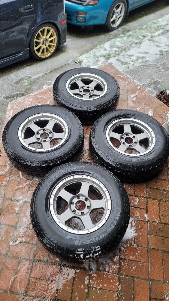 Hello, selling a used set of off-road wheels and tires. These use the Ford/Lincoln 6x135 Lug Pattern. Fits 2004-Current F150, 2004-Current Ford Expedition, 2004-Current Lincoln Navigator, 2004-Current Lincoln Mark LT, and others. Please do your research. All are clean, but 1 does have a nick on the lip (Pictured). All roll straight and hold air. Specs: 17x8.5 6x135mm Lug Pattern +18 Offset 265 70 17 Pathfinder All Terrain Tires With 30% Life. Recommend Replacing. Asking $275 or best offer thanks for looking and have a great day. Delivery available in the Greater Seattle Area for extra.