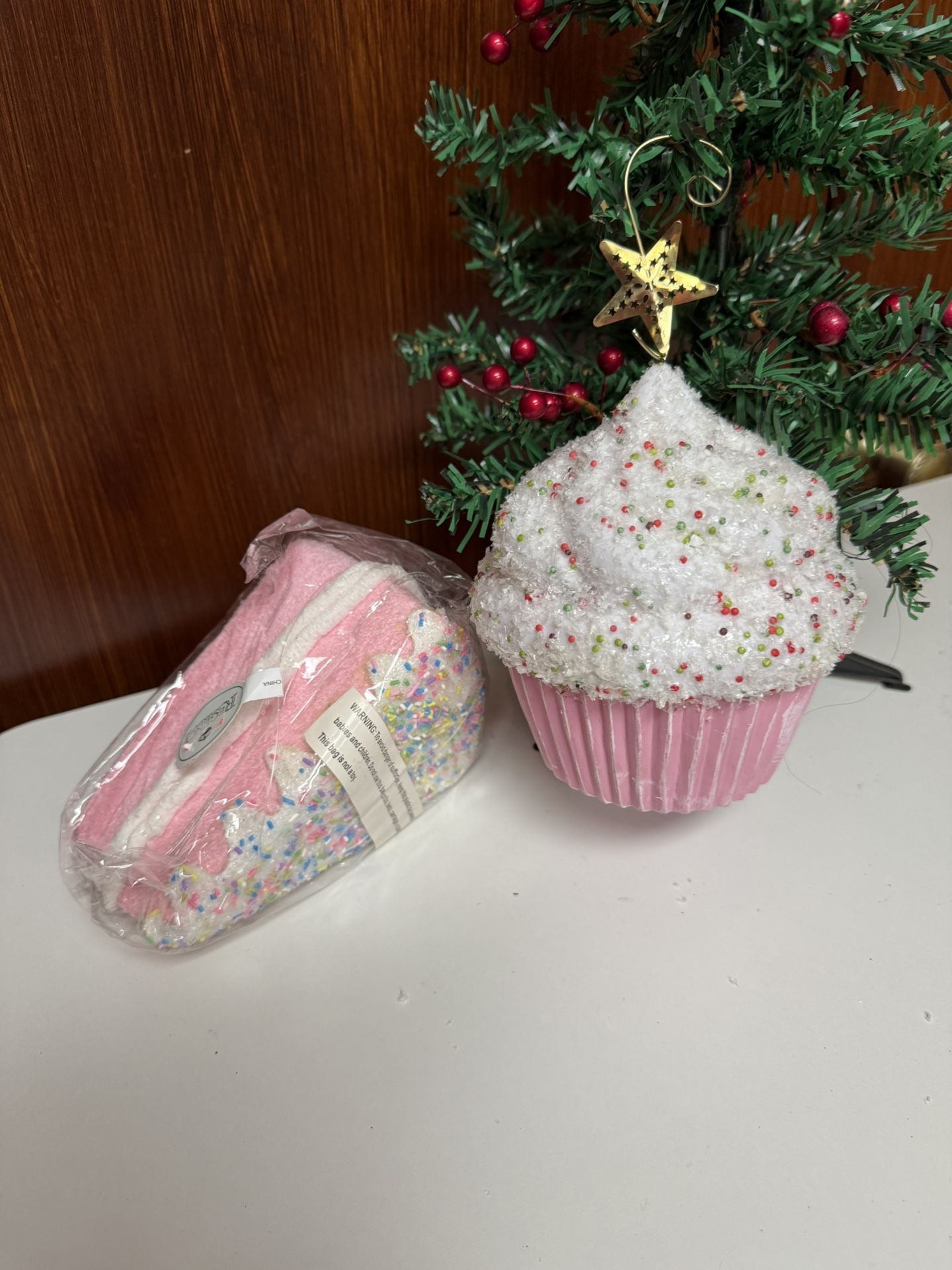 Add a sweet touch to your holiday decor with this charming pink cupcake ornament. Perfect for bringing festive cheer to your home. is a decorative cupcake ornament with a pink base and white glitter frosting. ® It features multi-colored "sprinkles" in red, green, and white. o The ornament is made of foam and is shatterproof. a It is designed for hanging on a Christmas tree or for general holiday decoration. The top includes a small gold star hanger Are new