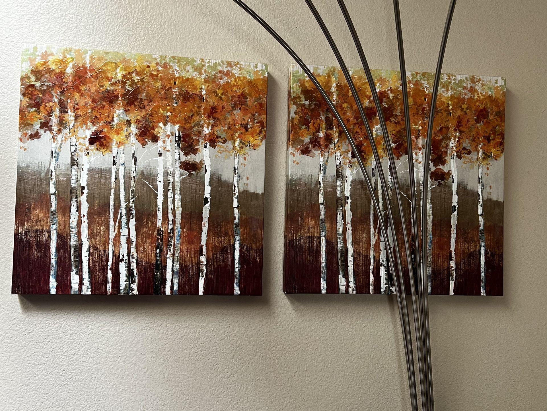 Multi-color diptych (2pictures) of forest scene. Each pic measures 20” x 20”. This will be a great addition to your wall. Canvas painting. Perfect condition.