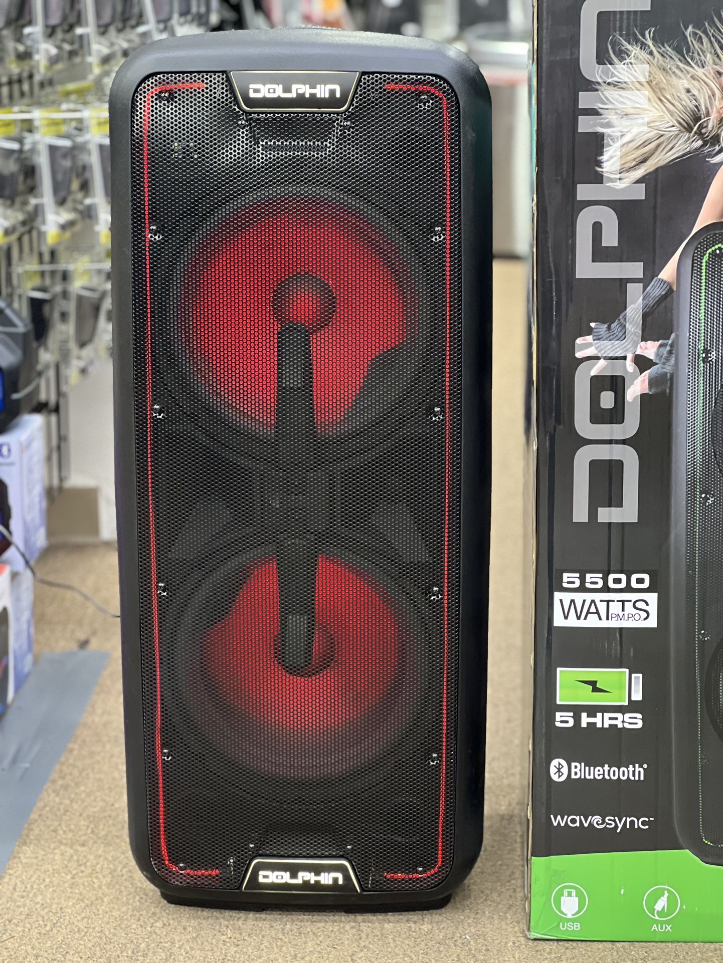 - Wavesync technology - Dual 12’’ woofers - Dual tweeters - Main channel output- Bluetooth, USB, SD, FM and RCA auxiliary - Channel 2- Two 1/4’’microphone jack with Bass, Treble, volume and echo control - One 1/4’’ guitar jack with volume control - 7000mAh 12V acid battery - 7 color neon style LED lights - LED indicator display - Handle and wheels - 55000 watts - Comes with remote control, wired microphone and AC Adaptor