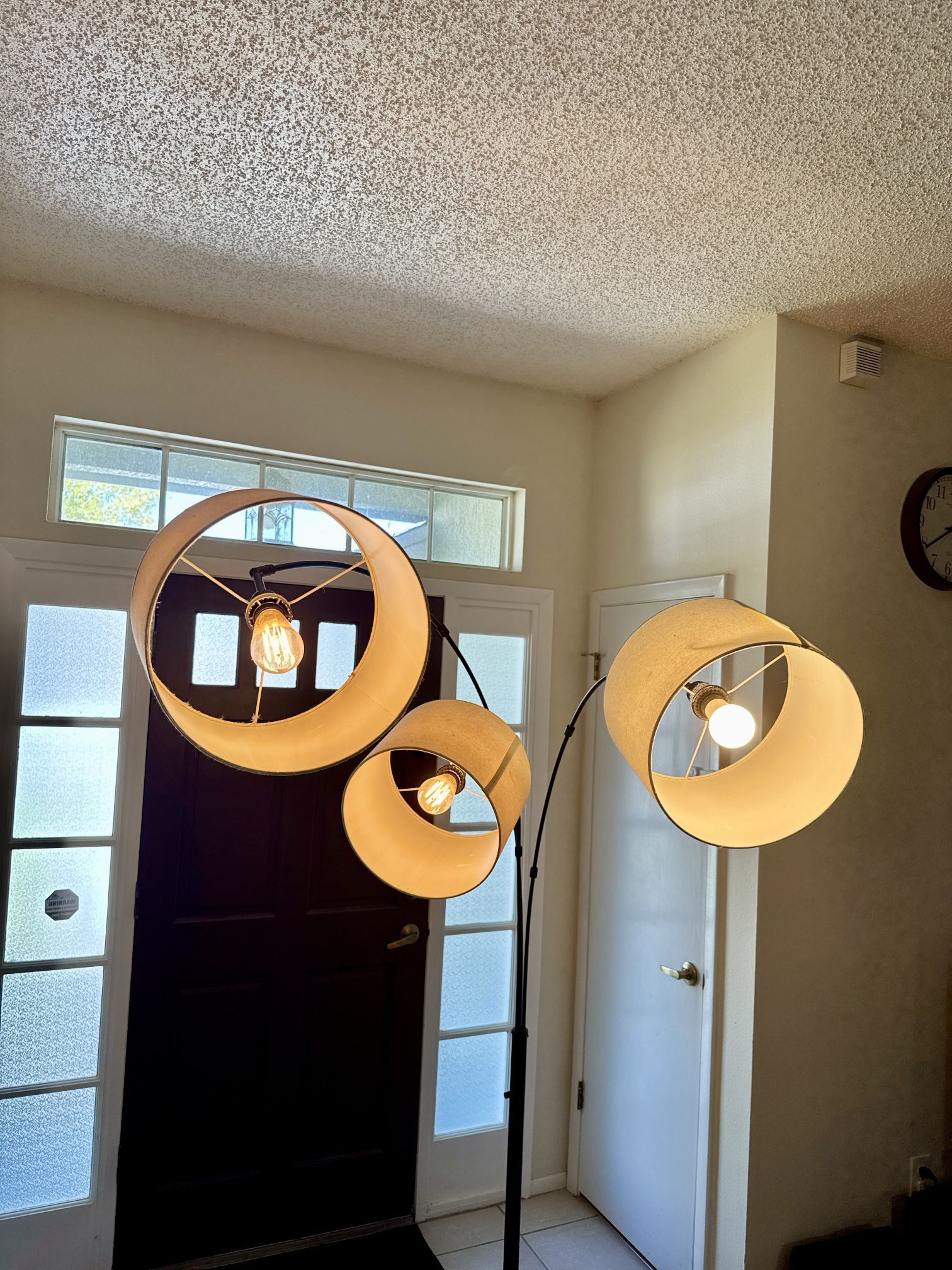 Beautiful modern 3-light arc floor lamp in great condition. This lamp adds a warm, cozy glow and stylish look to any living room, bedroom, or office. The adjustable arc design allows you to spread light across a wide area, making it both functional and decorative. Perfect for modern or minimalist home setups. Key Features • Condition • What’s Included: • 3-light arc floor lamp with curved arms • Neutral fabric drum shades (modern look) • Sturdy black metal base • Uses standard bulbs (included as shown) • Fully functional – all lights working • Condition: Good, minor wear from normal use • Includes: Lamp + shades + bulbs Measurements: • Height: ~78–82 inches • Width (arc span): ~40–45 inches • Base diameter: ~12–14 inches