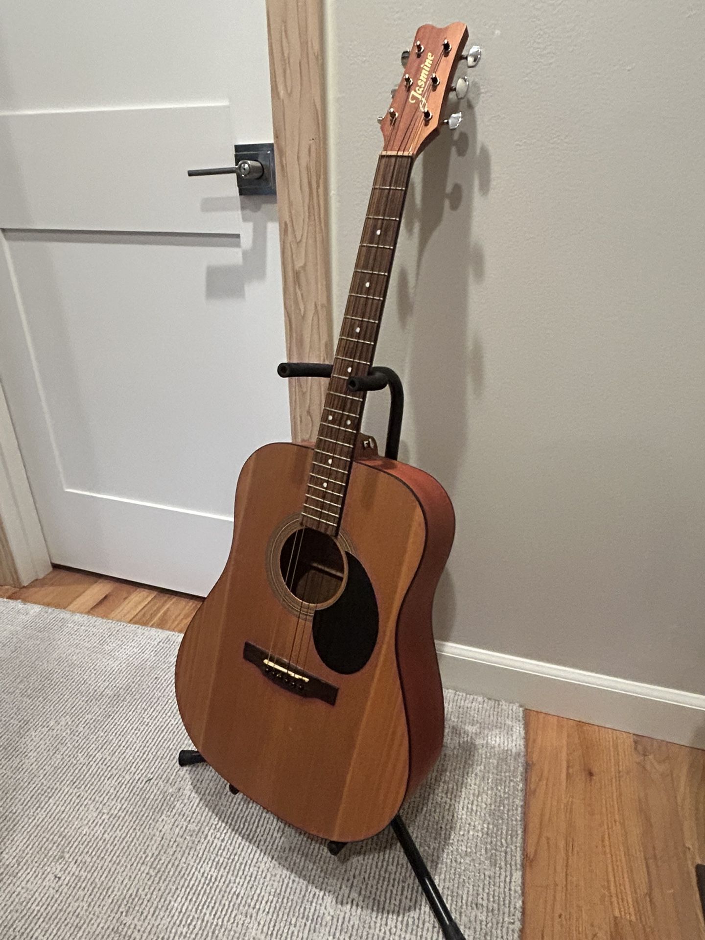 - Really good beginner guitar. - Great condition, minor dent in the front. - One string is missing (replacement string sets are about $10). - Retail is $120. - Pickup only
