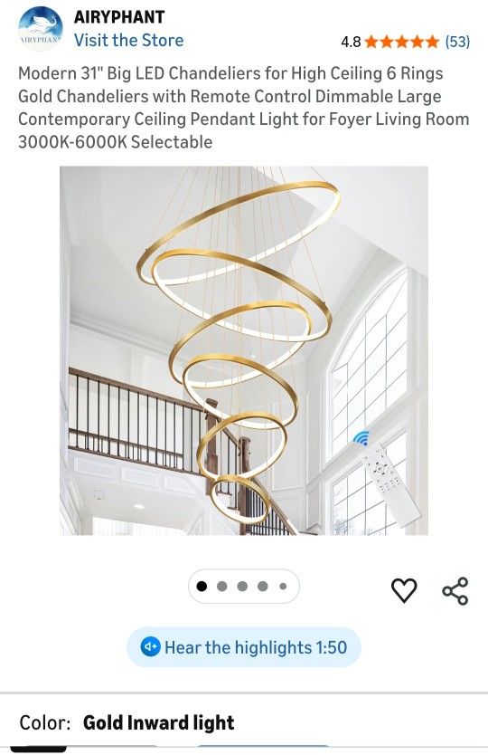 Modern 31" Big LED Chandeliers for High Ceiling 6 Rings Gold Chandeliers with Remote Control Dimmable Large Contemporary Ceiling Pendant Light for Foyer Living Room 3000K-6000K Selectable