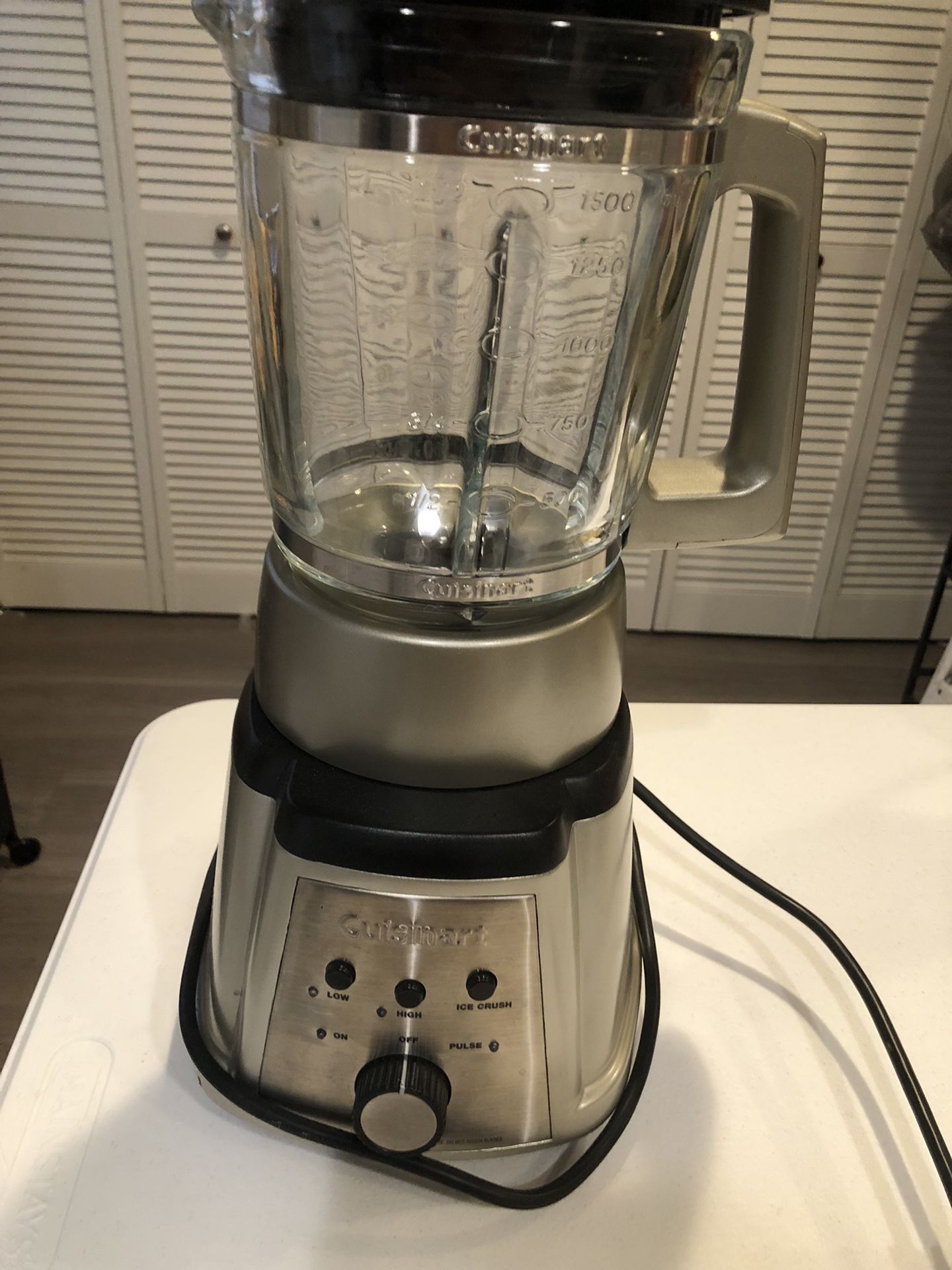 Cuisinart SmartPower Premier Blender, model CB-600, which has a 6-cup (50-ounce) capacity glass jar. Like- new condition, never used. Just sat in cabinet. This model features: * A 600-watt motor. * A heavy-duty cast metal and stainless steel construction. * Electronic touchpad controls with settings for low, high, and ice crush, as well as a pulse function. * A large-capacity glass jar that is dishwasher-safe.