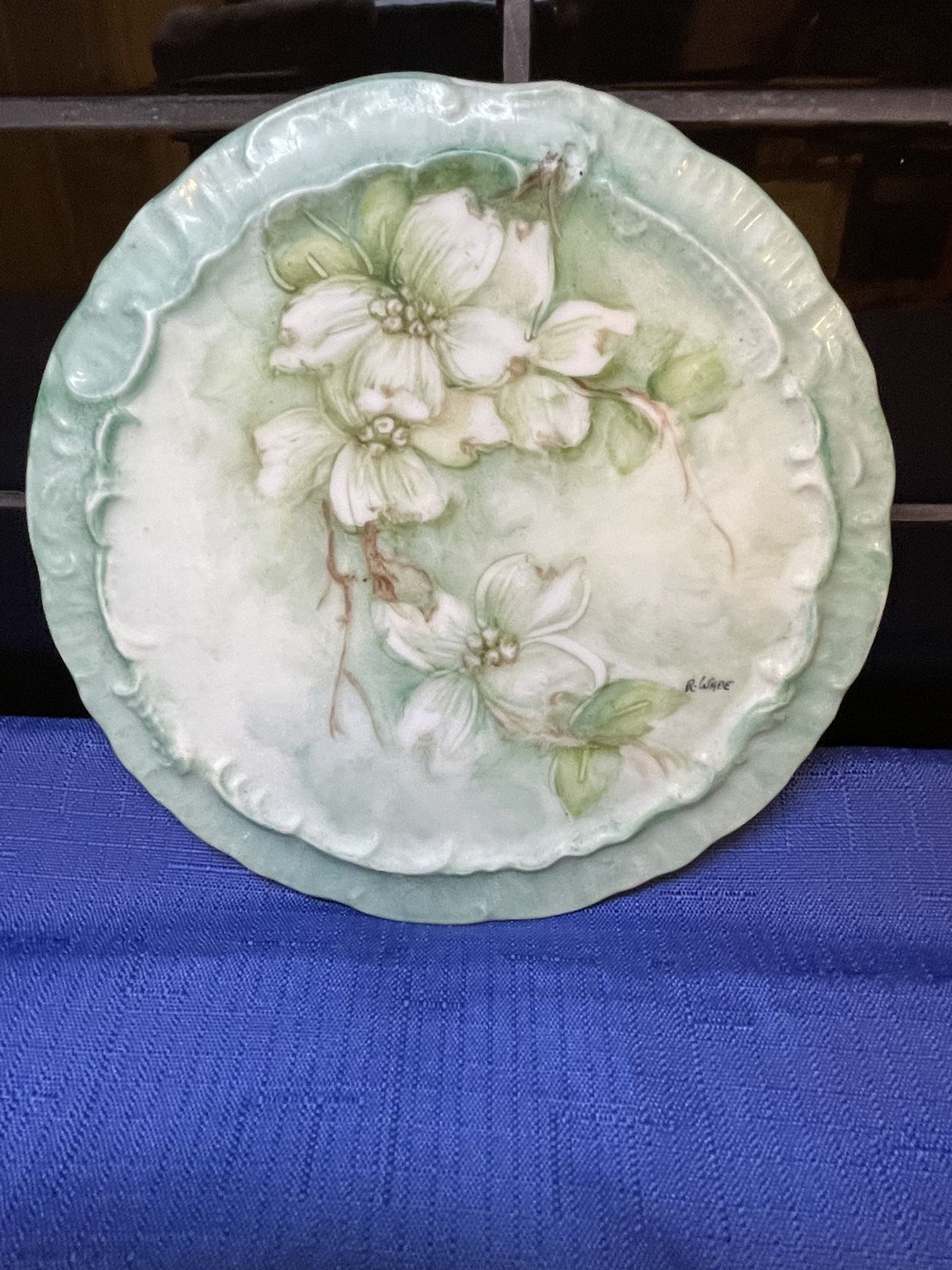 Beautiful vintage floral Victorian hand painted art plate, signed by artist, “ R.Wade”. Beautifully painted with white florals and green leaves with mint green background. Plate is dimensional, forming its own framed look with 2 step look. Holes already in back for hanging on a gallery wall or can be placed on an easel for your table. 6.5” Diameter