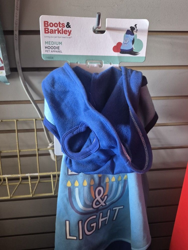 Boots & Barkley "Love & Light" Hanukkah dog hoodie in blue, size medium.