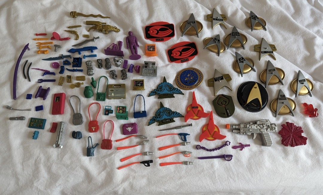 Vintage 1990s Playmates Star Trek TNG action figures accessories. Tons of accessories and badges. $48+shipping.