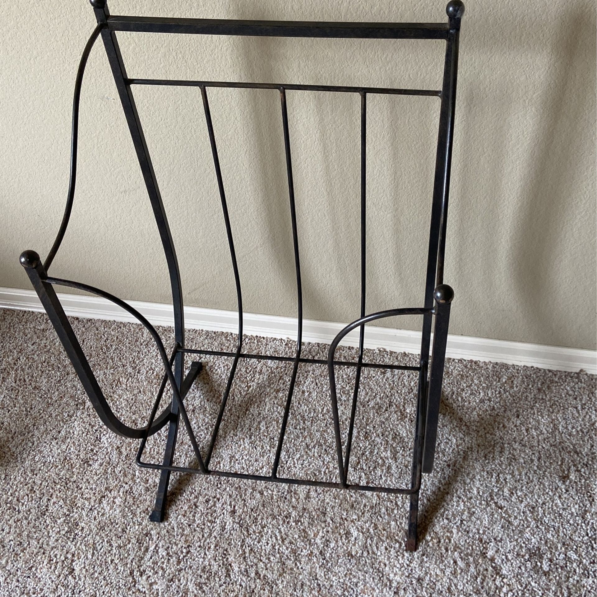 Metal Decorative Blanket Pillow Wood Holder Stack Organizer Dimensions 16”‘wide 12” deep 28” tall Has minor rust, solid frame