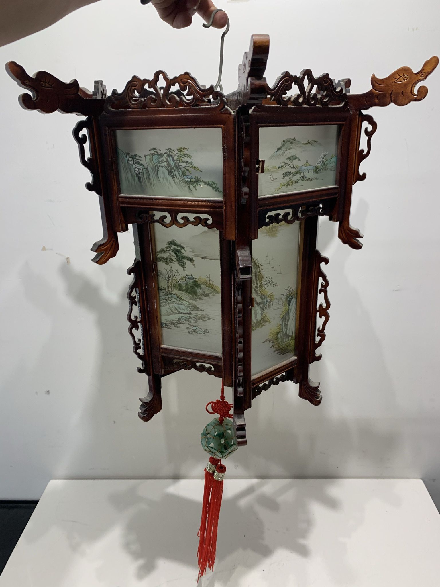 Antique Asian Carved Wood Lantern with Dragons and Painted Glass Panels -Asian lantern, Wood carved with dragons and painted glass panels -Comes with non-original light and chain. -Small lantern / chandelier / suspension. Structure in solid wood carved (dragons). -Production Period1890 to 1919 -Country of Origin: China -Style: Bohemian -Condition: Excellent — This vintage piece is in near original condition. It may show minimal traces of use and/or have slight restorations. -MaterialsWood, Antiqued Glass, Glass, Varnish Height15.5 inches Diameter17.5 inches -Measurements are in the pictures -Pickup in San Diego. FCFS. Cross posted. -No free holds. I will accept payment using PayPal or Venmo and then hold your item until you can pickup. -Comes from a Pet/Smoke free home -Item has been cleaned and sanitized: from a CoVID free environment.
