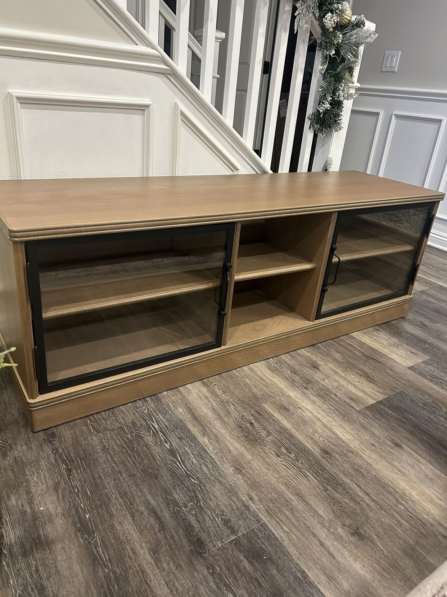 Excellent condition Entertainment Center/ TV stand . Two glass magnetic doors and sturdy wooden shelves. No stains. Nothing wrong with it, we decided to refurnish with different color scheme. Measurements: Height- 22 in Depth- 18 1/2 Width - 63 1/2