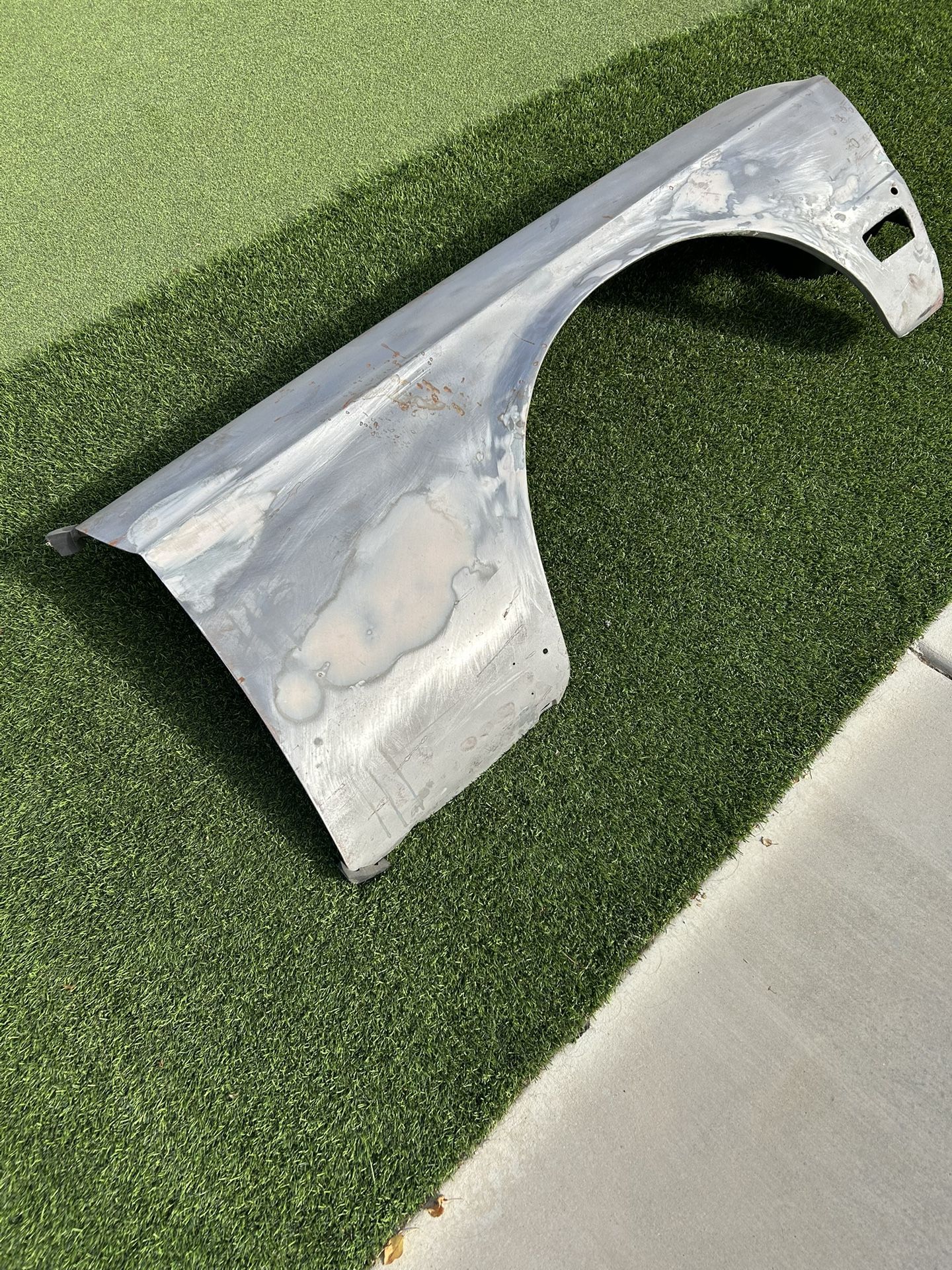 Solid fender, no rust, small dents, paint stripped, little bondo.