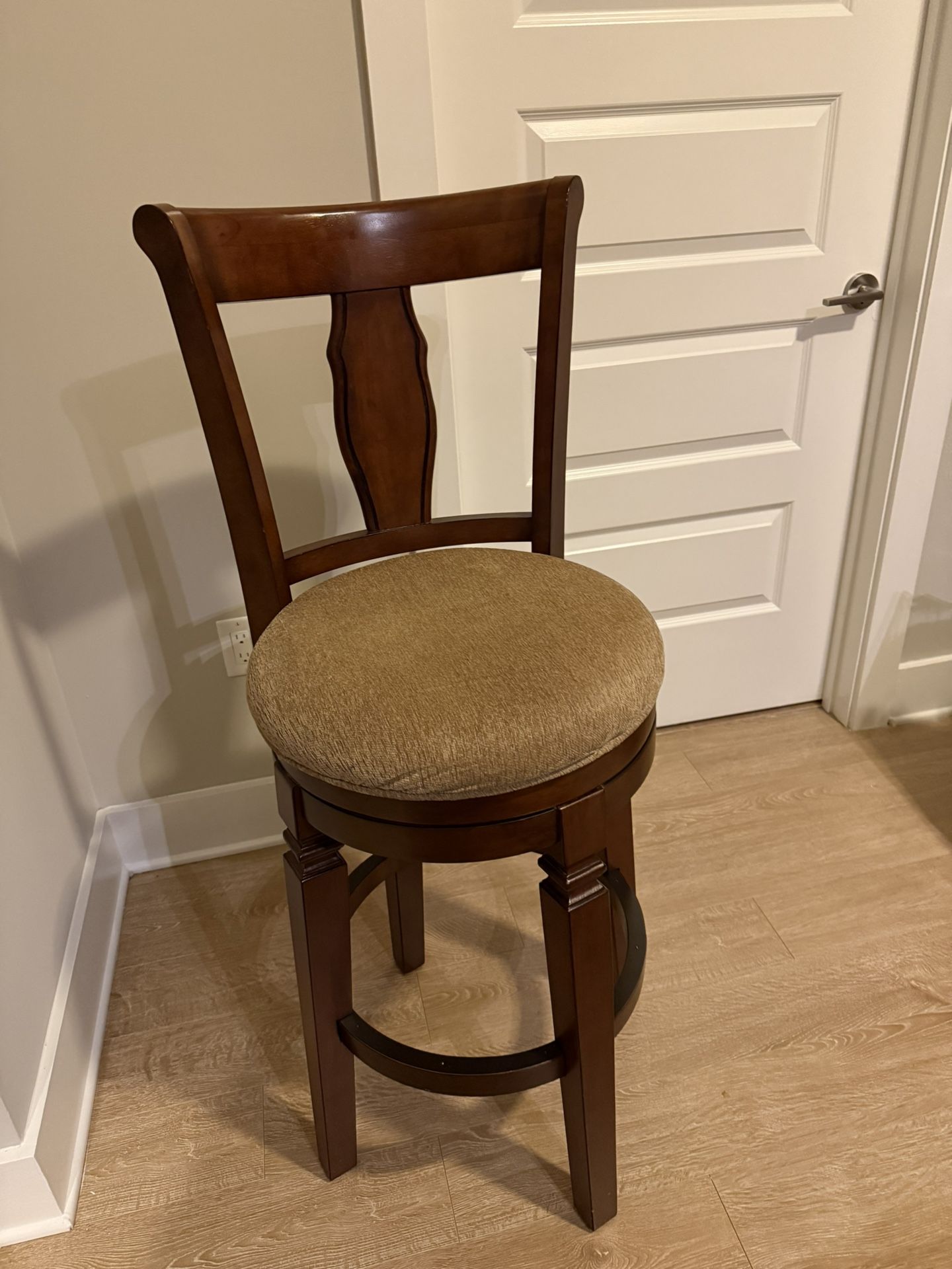 Set of 3 bar-height swivel stools with tan upholstered seating. Comfortable, sturdy, and easy to move. In good condition—light wear and minimal scratching on the back of one stool (cosmetic only). Great for a kitchen island or bar area. Pickup only. First come, first served. No holds.