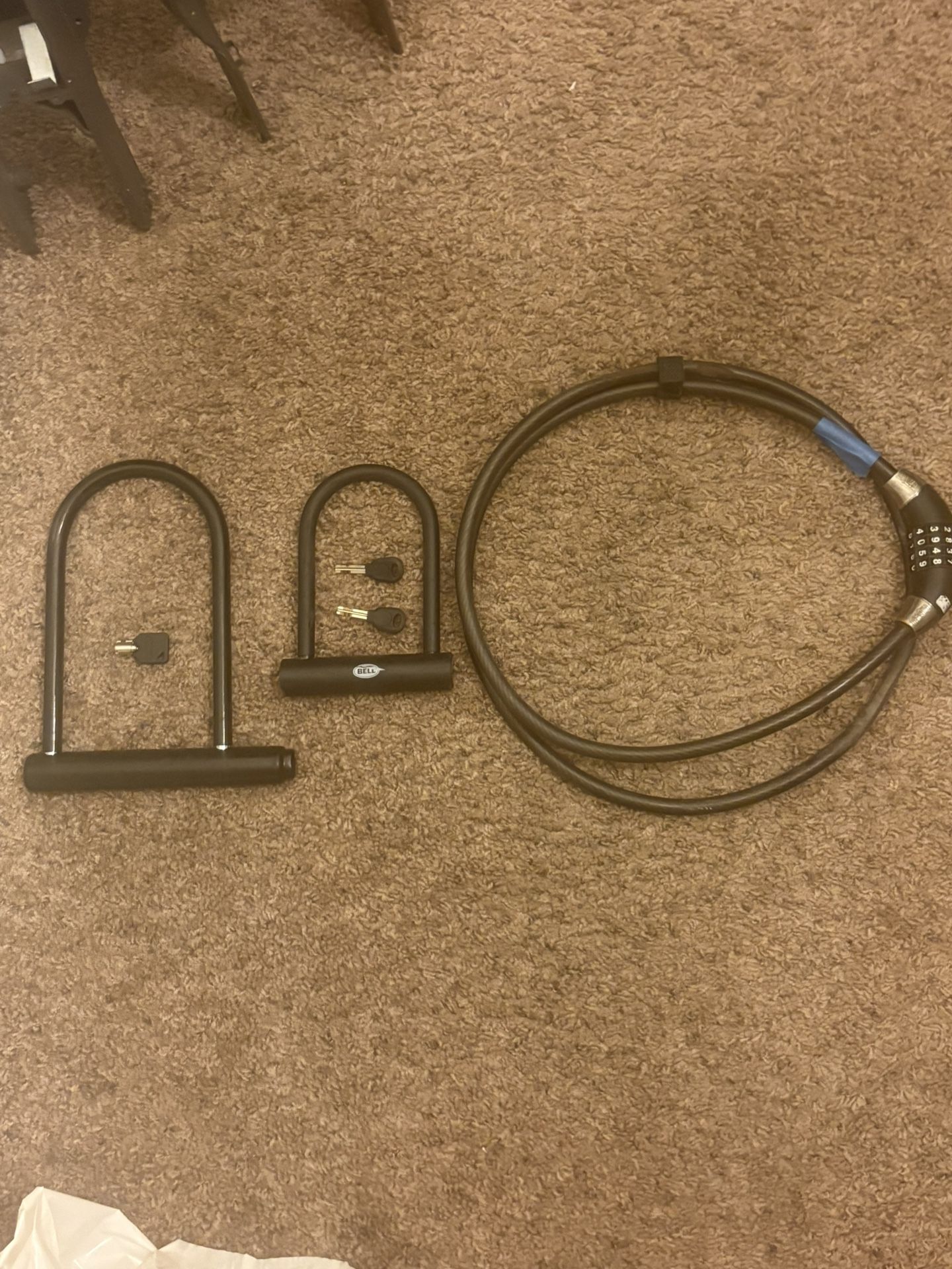 Have 3 locks that work for bikes and e-scooters. All have keys and one is a number code, which I have written on it. Price is for all 3