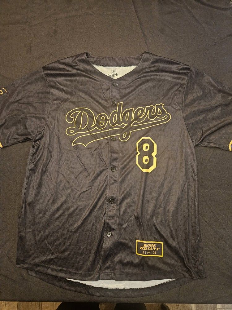 Selling a unique and highly sought-after Kobe Bryant Los Angeles Dodgers baseball jersey. This special edition "Lakers Night" item is a fantastic crossover collectible for fans of both LA teams. Size: Men's XL Color: Black with gold lettering and numbering Details: Features a special patch with both Mamba numbers, 8 and 24 Condition: Pre-owned
