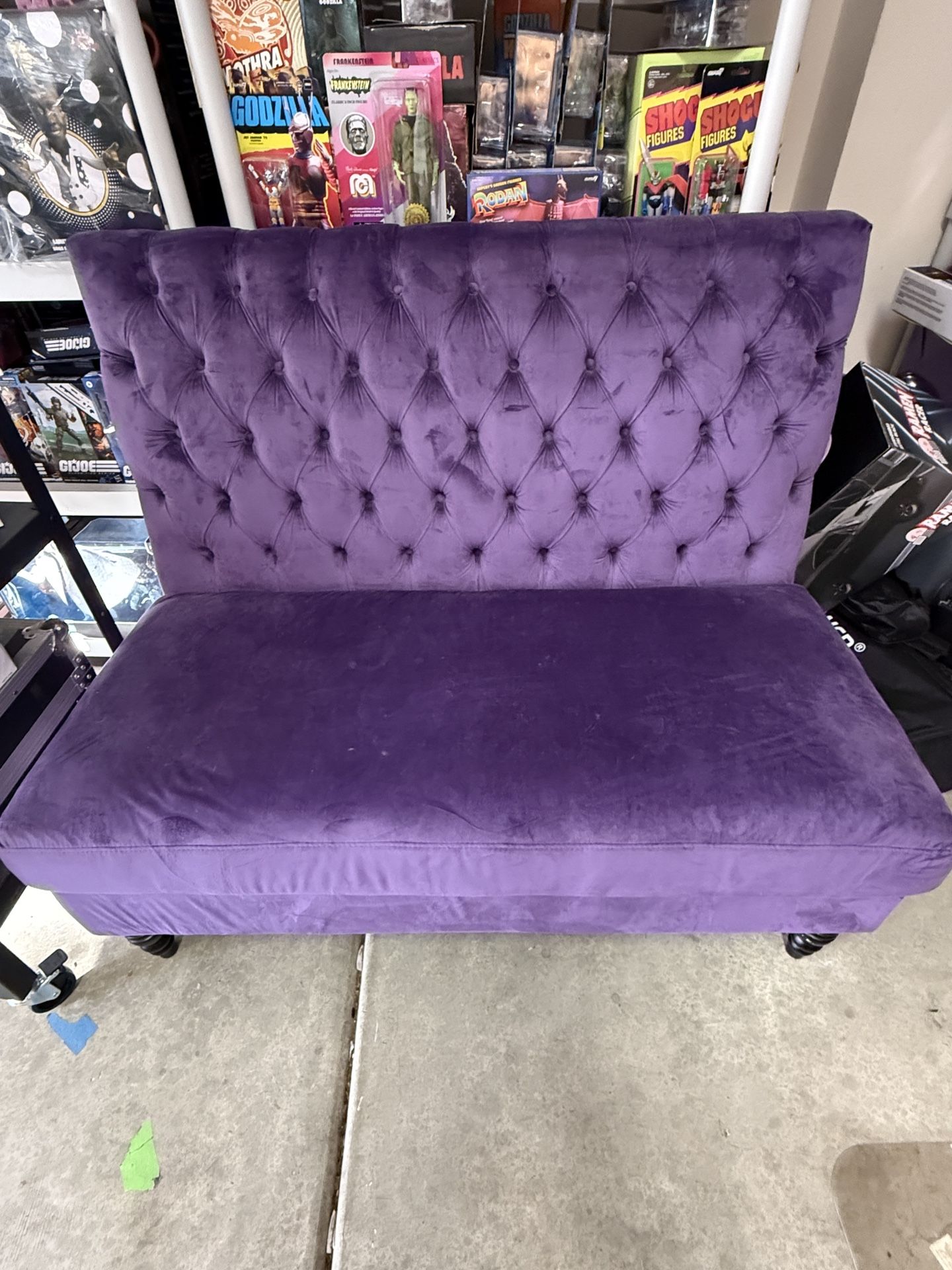 Gently used , purple tufted velvet love seat / small couch . H 40.5” x L 48” D 28 “