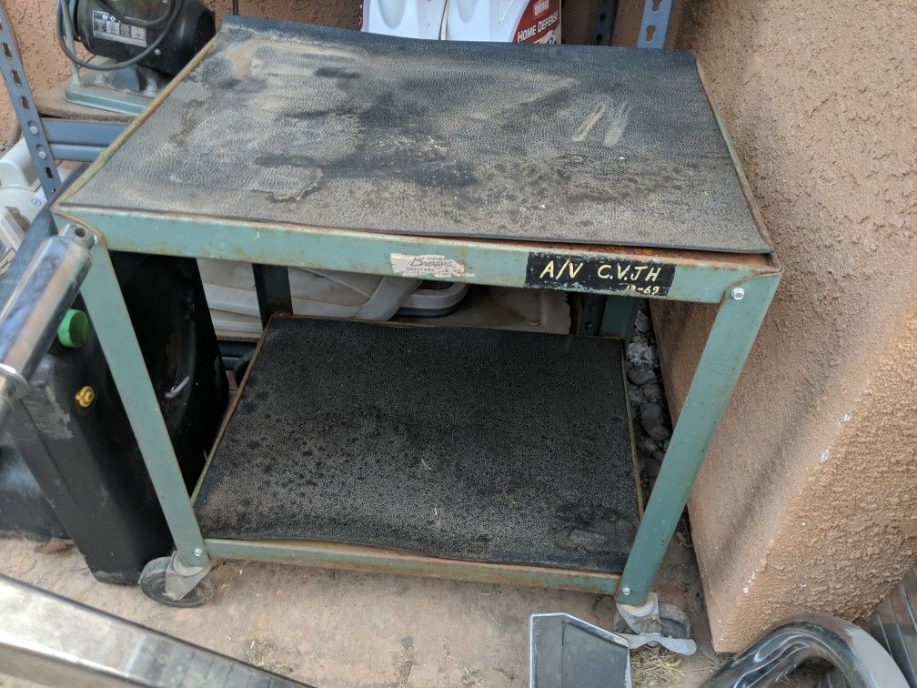 Old Chula Vista Junior High AV cart from 1969. Original teal paint with rustic patina and wear. Awesome bar cart, patio table or side table. 4 wheel cart with casters 2ft by26 inches 2 shelves with rubber mats.