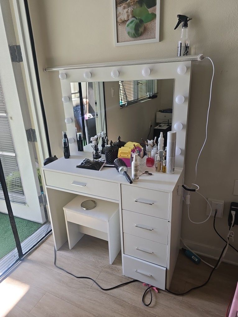 37" Vanity Desk with Mirror & LED Lights, Makeup Vanity with Power Outlet & USB, 3 Lighting Modes, Dressing Table with 5 Drawers & Stool for Bedroom, White Amazon's