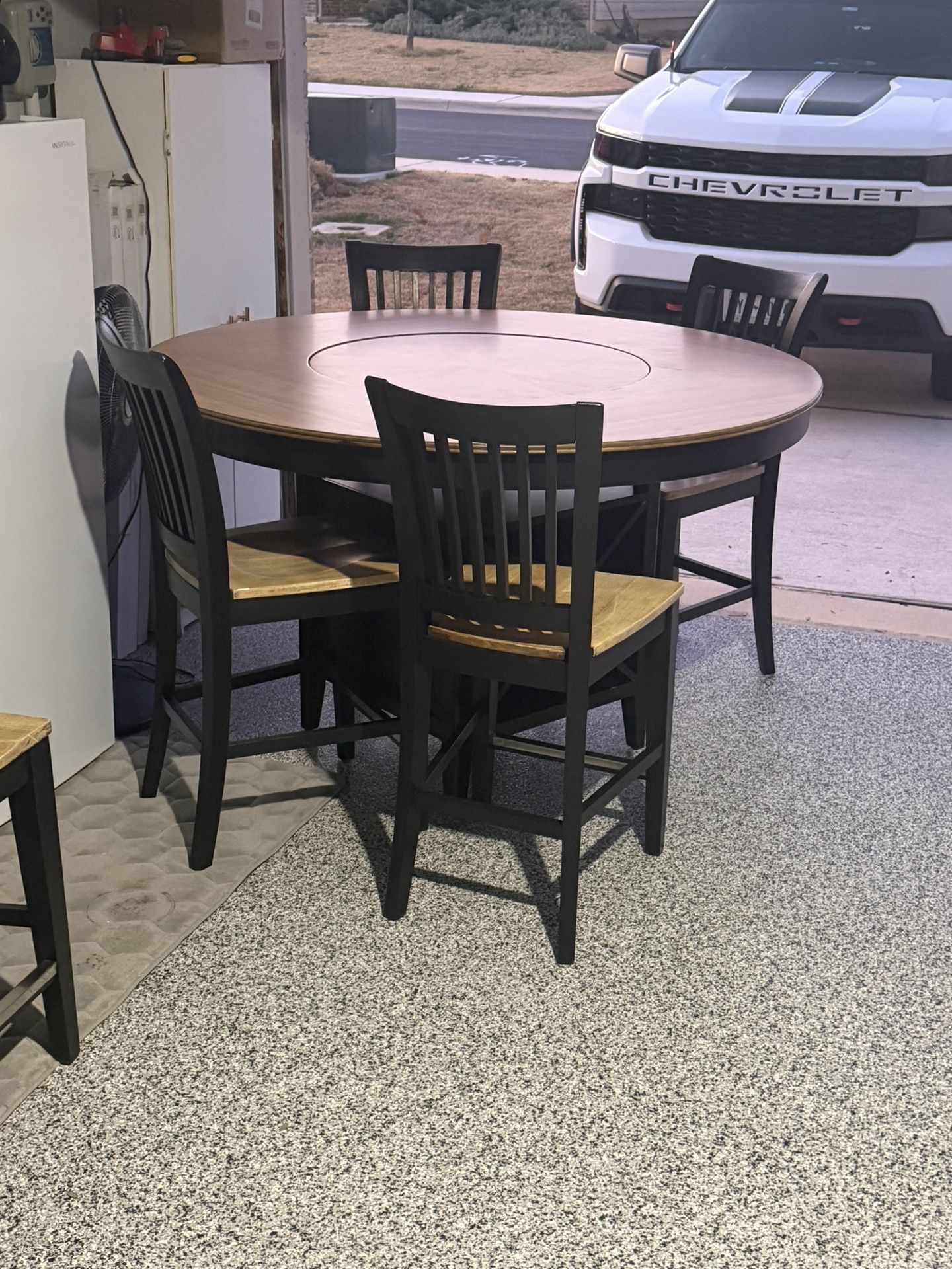 This solid wood table features a bold black base with a built-in side shelf and wine holder for added functionality. A matching lazy Susan centerpiece adds convenience, making it perfect for sharing meals or entertaining guests. Finished with three coats of water-based matte clear, it offers a smooth, durable surface with a modern, low-sheen look. Sturdy, stylish, and practical — built for everyday use and gatherings alike.