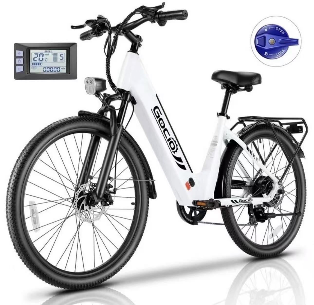 The GOCIO brand focuses not only on the performance of the e-bike but also on aesthetics and practicality. This cruiser ebike features an ergonomic design. The step-thru frame design makes it extremely easy to get on and off, especially for cyclists with limited mobility. The aluminum alloy ensures the lightweight of the frame, excellent strength and durability. The frame's premium color and exquisite matte texture highlight an exceptional sense of quality. With adjustable seat height, spring cushions, grips that fit the human hand's shape, and an easy LCD to operate and read, these ergonomic designs ensure optimal comfort and riding efficiency, making every journey more comfortable and enjoyable. 500W REAR DRIVE MOTOR: The peak 750W motor provides a top speed of 19.9mph to easily solve the problem of traffic jams on the way to work. It ensures a max climb ratio of 30%, avoiding the awkward situation of not being able to climb the slope. The 7-speed shift button puts speed precisely at your fingertips. 48V 10.4AH BUILT-IN REMOVABLE BATTERY: The 499Wh lithium-ion battery offers extended range and less frequent charging, which can travel max 50 miles on a 5-6 hour charge. The built-in design makes the appearance of a streamlined, lightweight and sleek, but also can play the role of waterproof (IPX5) and dust. LOCKABLE SUSPENSION FRONT FORK: The Lockable suspension fork is a feature of city ebikes. When unlocked, it absorbs shocks and vibrations from rough terrain. When locked, it can improve riding efficiency on flat roads. Whether riding on exploring off-road trails or city streets, it ensures optimal performance and comfort in any situation. 3 + 2 RIDING MODES: This electric bicycle outdoor has 3 common riding modes, namely throttle mode, pedal only mode and pedal assist mode. And there are also 2 unique GOCIO riding modes. 🚴♀️x 1 Booster Mode: Provides extra power for easy climbing. 🚴♀️x 1 Cruise Control Mode: Maintain a constant speed, avoid frequent speed adjustment, improve ride comfort and efficiency. 26" x 2.1" WIDER TIRES: In corners, 2.1" wider tires provide stronger lateral support than 1.95" tires and can be applied to more scenarios. It can reflect an extremely strong grip, especially on lawn roads, muddy roads, gravel roads, city roads, and other roads. Ebike Specifictions: Brand: Gocio Waterproof: IPX5 Frame Material: Aluminum Alloy Ebike Weight: 66Lbs Load Capacity: 300Lbs Wheel Size: 26" x 2.1" fat tire Motor Power: 500W(750W Peak) Max Speed: 19.9Mph Max Ratio of Climb: 30% Gears: Shimano 7-Speed Battery Voltage: 48V 10.4Ah(Certified UL 2849) Charging Time: 5-6 Hours Mileage Range: 50 Miles in PAS, 25 Miles in Throttle Mode LCD (5 assist levels): Speed Level, Speed, Battery, Mileage Suspension System: Lockable Front Suspension Fork Brake Details: Mechanical Disc-Brake Ebike Size: 68.90" x 25.39" x 40.55" Seat Adjustable Height: 31.89"-39.76" Package Size: 57.48" x 9.84" x 32.68" Recommend Height: 61.02"-72.83" Applicable Terrain: Beach, Snow, Lawn, Grave, Muddy Road Recommended Uses: Neighborhood, Exercise, Travel, Commuting Package Content: 1 x Electric Bike 1 x Built-In Battery 1 x Charger 1 x Headlight 1 x Rear Reflector 2 x Fenders 2 x Keys 1 x Toolkit 1 x English Manual