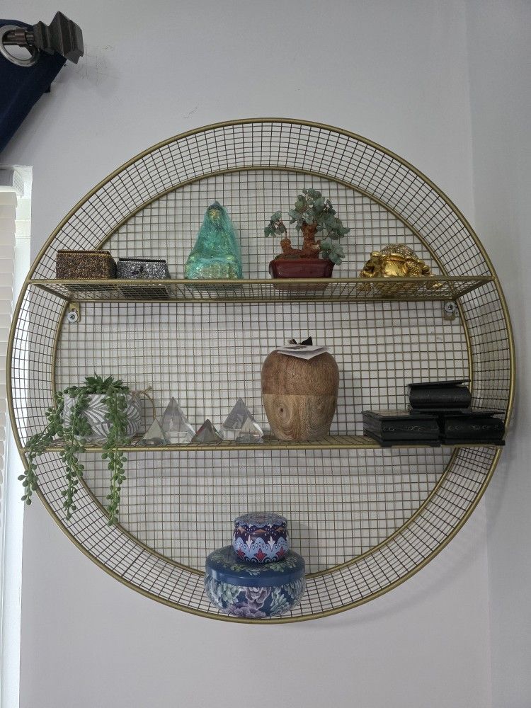 TEMA MODERNO: Inspirado en la elegancia elegante y líneas limpias, un diseño minimalista ofrece lujo sin esfuerzo con tonos monocromáticos y estructuras angulares audaces HECHO DE HIERRO: El estante de pared redondo está hecho de material metálico sólido y de alta calidad ACABADO SATINADO ORO: Un estante decorativo redondo de pared con un acabado dorado que añade glamour a su diseño interior ESTANTE DE PARED REDONDA: El estante de estilo moderno cuenta con una estructura redonda con 2 estantes interiores y viene con patrones perforados Tamaño grande: el estante de pared de metal dorado mide 28 pulgadas de largo x 5 pulgadas de ancho x 28 pulgadas de alto, y pesa 7.50 libras