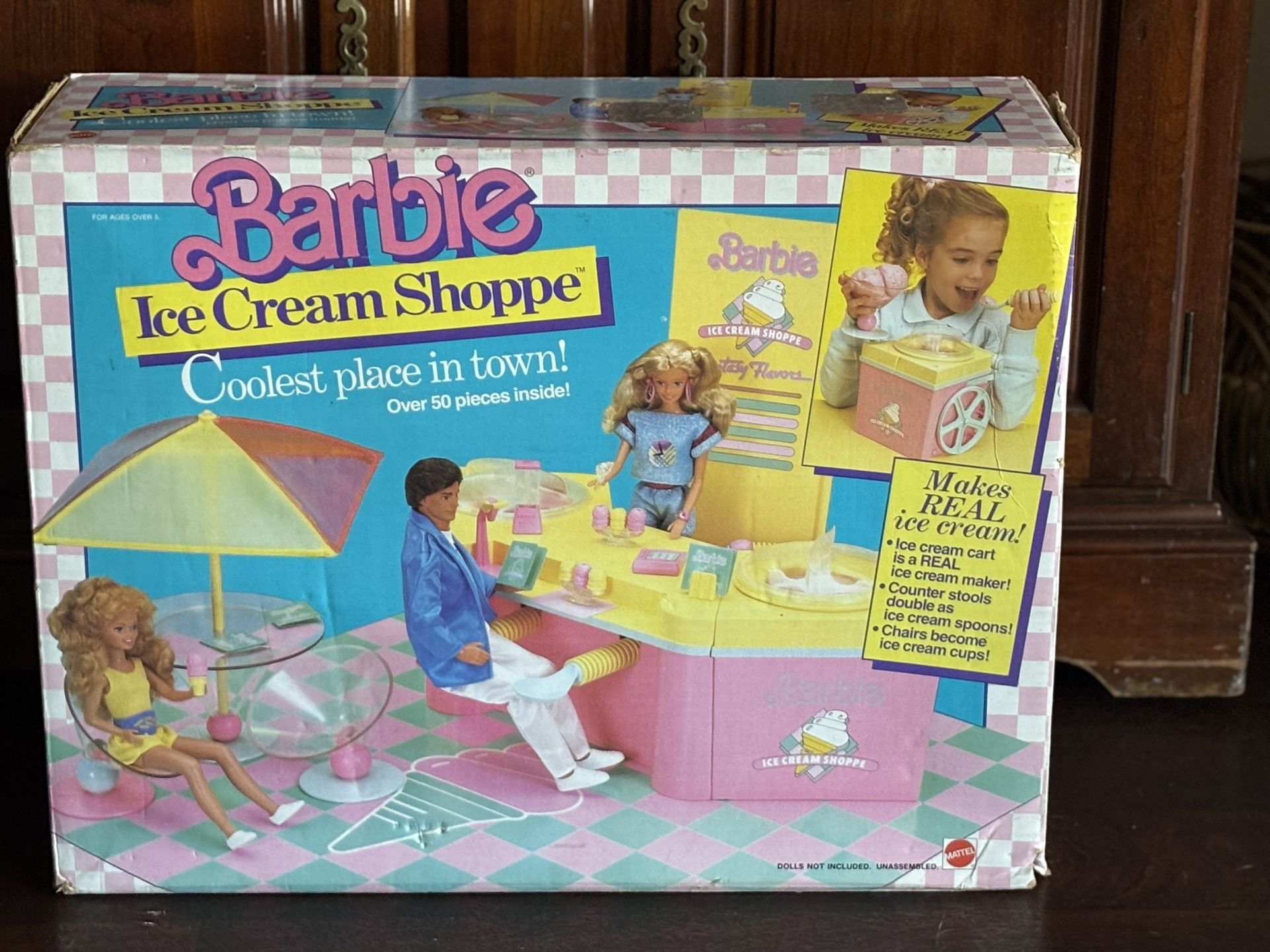 Ice Cream Shoppe in box. Box is worn and has cello tape. The table is the only piece that has a break in it. No missing pieces. “You and Barbie can create "sweet treats" in your own ice cream parlor. Twist your own "Ice Cream" scoop.” **Price Drop!**